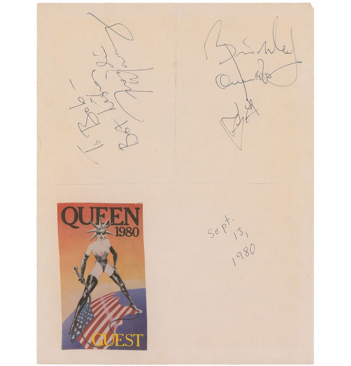 Ballpoint signatures and inscription, “To Bob—Best wishes, Freddie Mercury,” “Brian May,” and “John Deacon,” on an off-white 8.5 x 11 sheet bearing an affixed concert guest pass and date notation of September 13, 1980. In fine condition, with central vertical and horizontal folds (not affecting signatures) and overall handling creases.