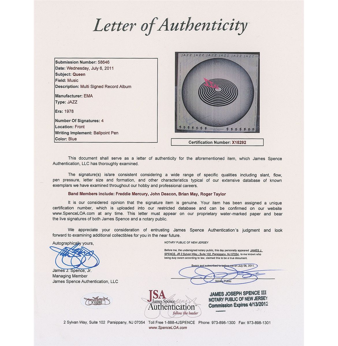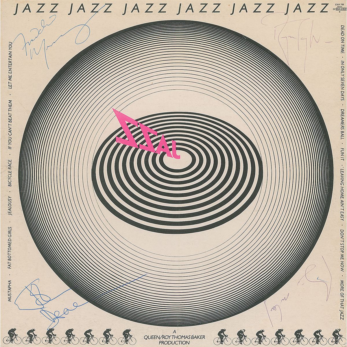 Jazz album signed on the back cover in ballpoint by Freddie Mercury, Brian May, John Deacon, and Roger Taylor. In fine condition, with scattered edge and spine wear, a few creases to front cover, and a few corner tip dings. The record is not included. Accompanied by a full letter of authenticity from Roger Epperson/REAL as well as a full letter of authenticity from James Spence.