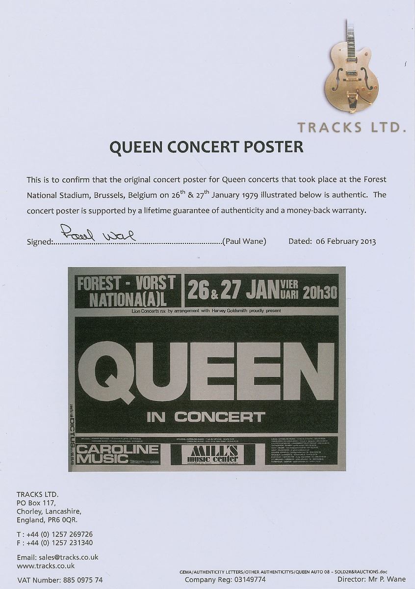 Original 33.75 x 24 Lion Concerts presented promotional poster for a two-day Queen concert held at the Forest National Stadium in Brussels, Belgium on January 26/27, [1979]. Rolled and in fine condition, with some creasing to lower left corner and border. Accompanied by a certificate of authenticity from Tracks.