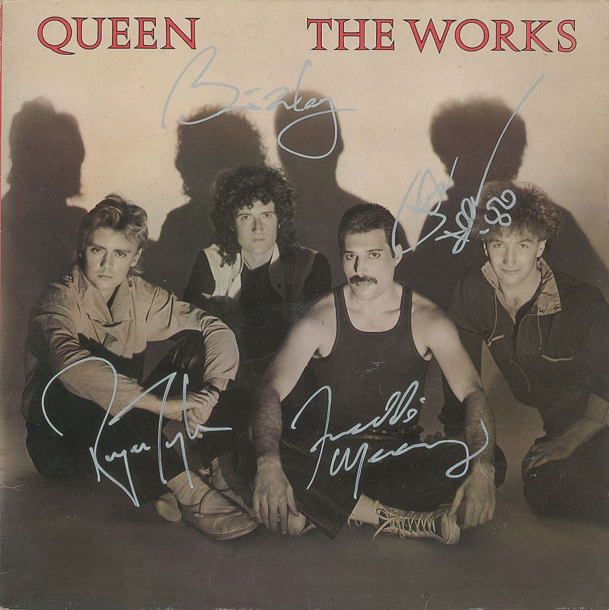 The Works album signed on the front cover in silver ink by Freddie Mercury, Brian May, John Deacon, and Roger Taylor. In fine condition, with a mild album impression to front cover and a few mild edge creases. The record is included. Consignor notes that the autographs were obtained in Barcelona, Spain, in 1986 during Queen’s Magic European Tour. This album boasts particularly bold and crisp signatures.