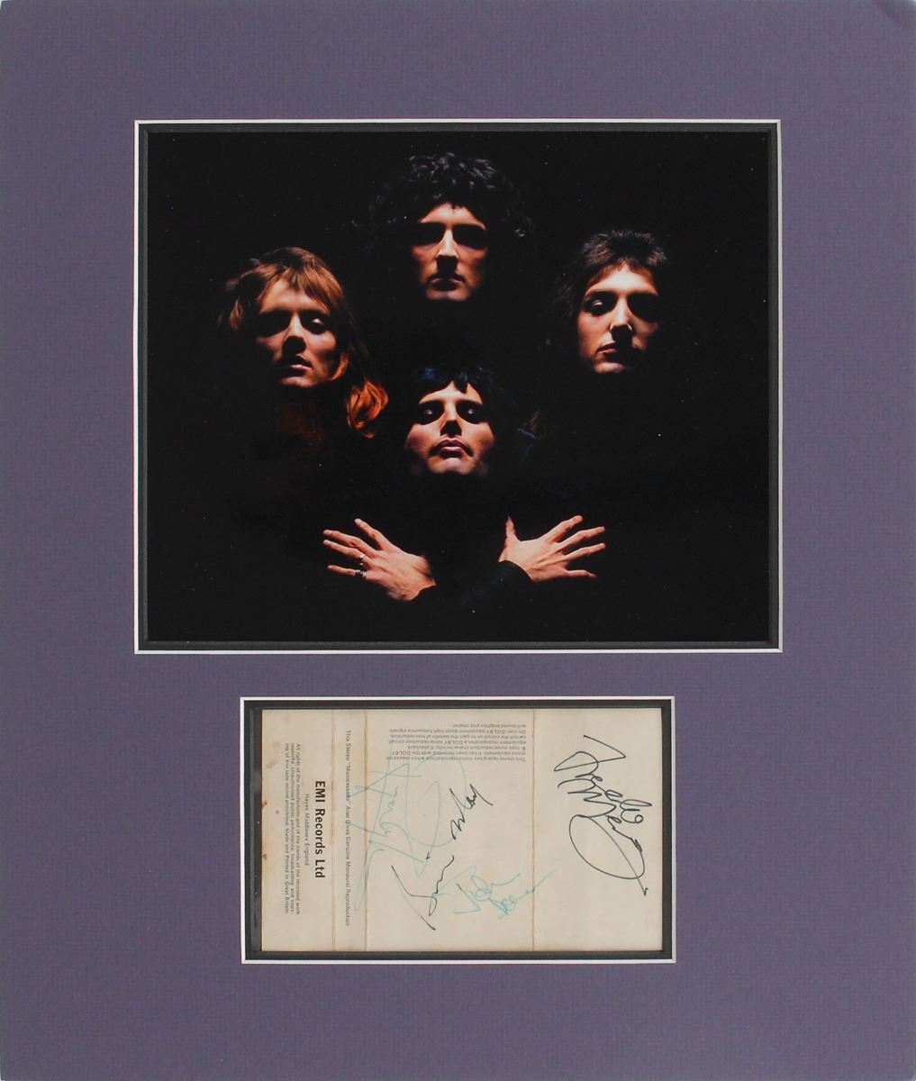 EMI Records Ltd. cassette sleeve, 6 x 3.75, signed in black felt tip by Freddie Mercury and Brian May, and in green ink by John Deacon and Roger Taylor. Double-matted with an image of the front cover for the album Queen II to an overall size of 14 x 16.5. In fine condition, with light soiling. The cassette is not included.