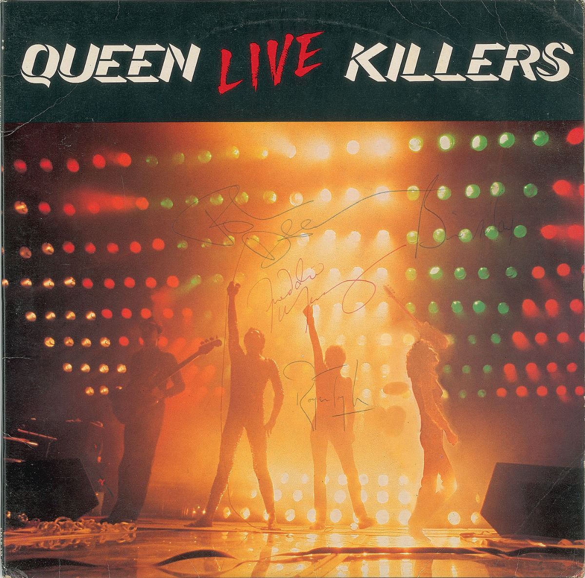Live Killers album signed on the front cover in red ballpoint by Freddie Mercury, and in black ballpoint by John Deacon, Brian May, and Roger Taylor. In fine condition, with some creasing to the corners. The records are included. An attractive fully signed example.