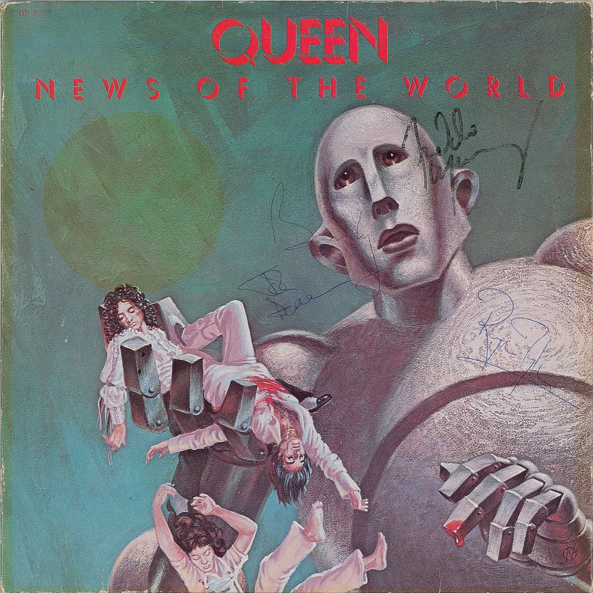 News of the World album signed on the front cover in black felt tip by Freddie Mercury, in blue ballpoint by John Deacon and Roger Taylor, and in black ballpoint by Brian May. In fine condition, with mounting remnants and surface loss on the back cover. The record is not included. Accompanied by a full letter of authenticity from JSA.