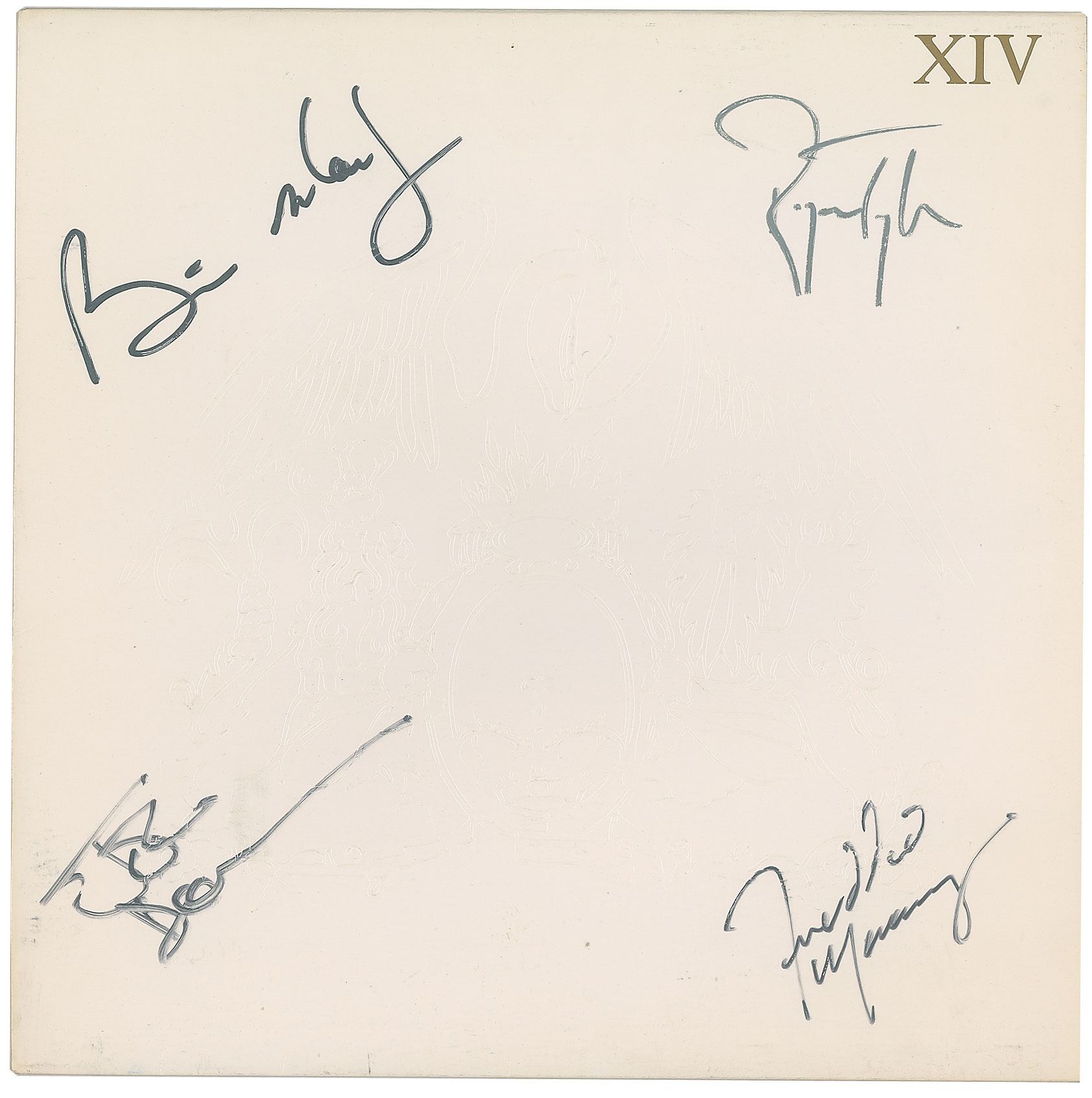 Complete Vision album signed on the front cover in black felt tip by Freddie Mercury and John Deacon, and in silver ink by Brian May and Roger Taylor. In fine to very fine condition. The record is not included. Accompanied by a certificate of authenticity from Tracks. In 1985, Queen assembled Complete Works, a box set of all their released and unreleased material up to that point. Included in the set was Complete Vision, a bonus LP that contained non-album A-sides and B-sides. An ideal display piece given the striking contrast of the bold, neatly arranged signatures against the embossed white cover.