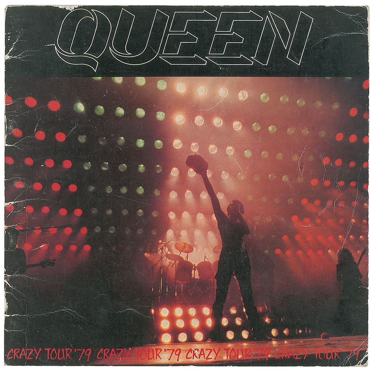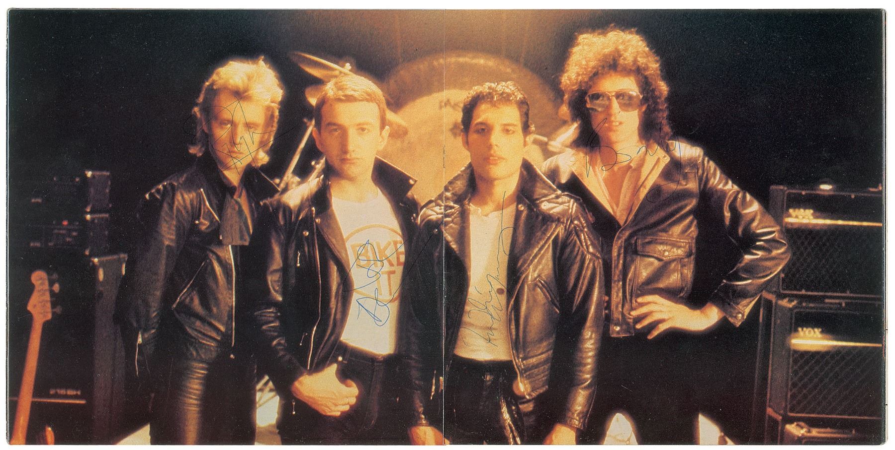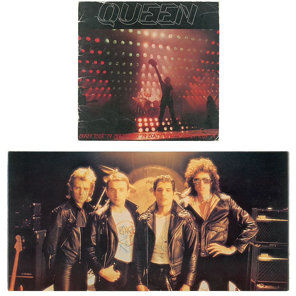 Highly desirable program for Queen's 1979 Crazy Tour, 9.5 x 9.5, signed inside in blue ballpoint by Freddie Mercury, Brian May, John Deacon, and Roger Taylor. In very good to fine condition, with moderate overall handling wear. A superb fully signed, uninscribed piece from the band's intimate tour of smaller UK venues.