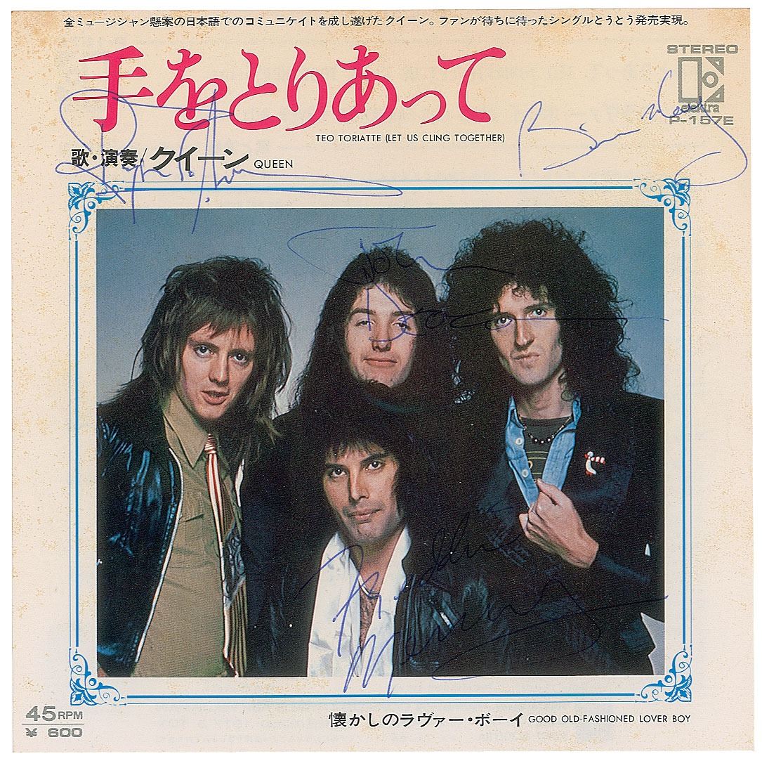 Sought-after Japanese pressing of the Elektra Records 45 RPM record for the Queen single 'Teo Torriatte (Let Us Cling Together) / Good Old-Fashioned Lover Boy,' signed on the front cover in blue ballpoint by Freddie Mercury, Brian May, Roger Taylor, and John Deacon. In fine condition, with poor contrast to parts of the Mercury and Deacon signatures. The record is included.