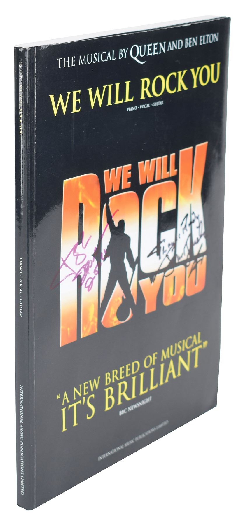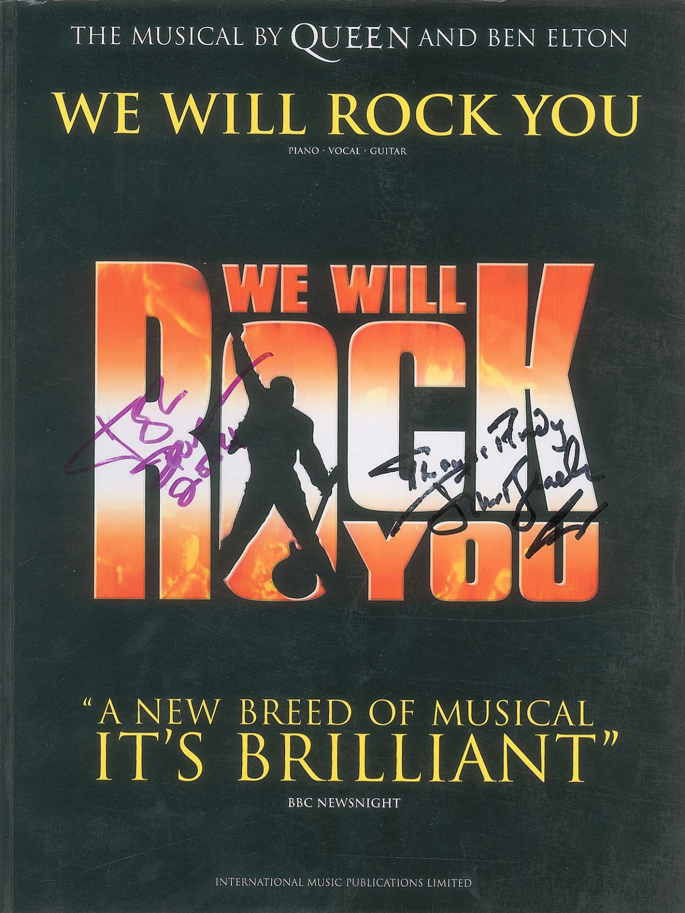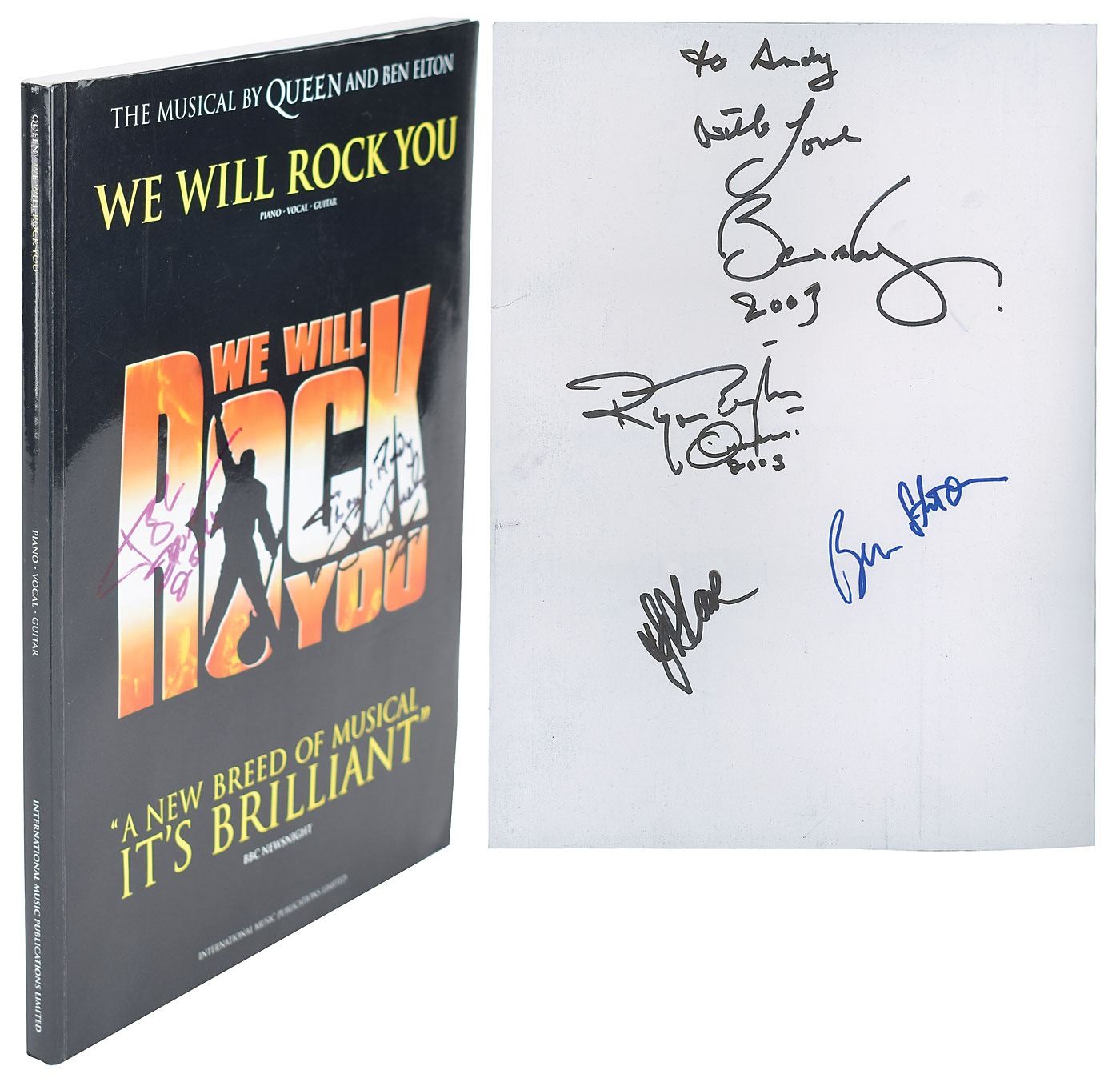 Signed book: We Will Rock You: The Musical by Queen and Ben Elton. International Music Publications Limited, 2003. Softcover, 9 x 12, 184 pages. Signed on the front cover in purple felt tip, John Deacon, 2004," and on the inside front cover in black felt tip, "Roger Taylor, Queen, 2003" and "Brian May, 2003," who adds the inscription, "To Andy, with love." The book also features signatures from three cast or crew members from the musical, including playwright Ben Elton. In fine condition, with light handling wear.