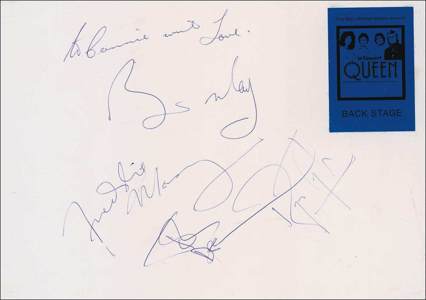 Ballpoint signatures and inscription, “To Connie, With Love, Brian May,” “Freddie Mercury,” “John Deacon,” and “Roger Taylor,” on an off-white 11.5 x 8.25 sheet with a Queen backstage pass affixed to top right corner. Some scattered light creases and wrinkles, otherwise fine condition. Accompanied by an untranslated letter of provenance, in German, from the signatures original in-person recipient, who was a constant member of the ‘in crowd’ at concerts in Stuttgart, Germany. Judging by the affixed pass, signatures were probably acquired during their 1979 tour of Germany, the same year they also released their first live album, Live Killers.