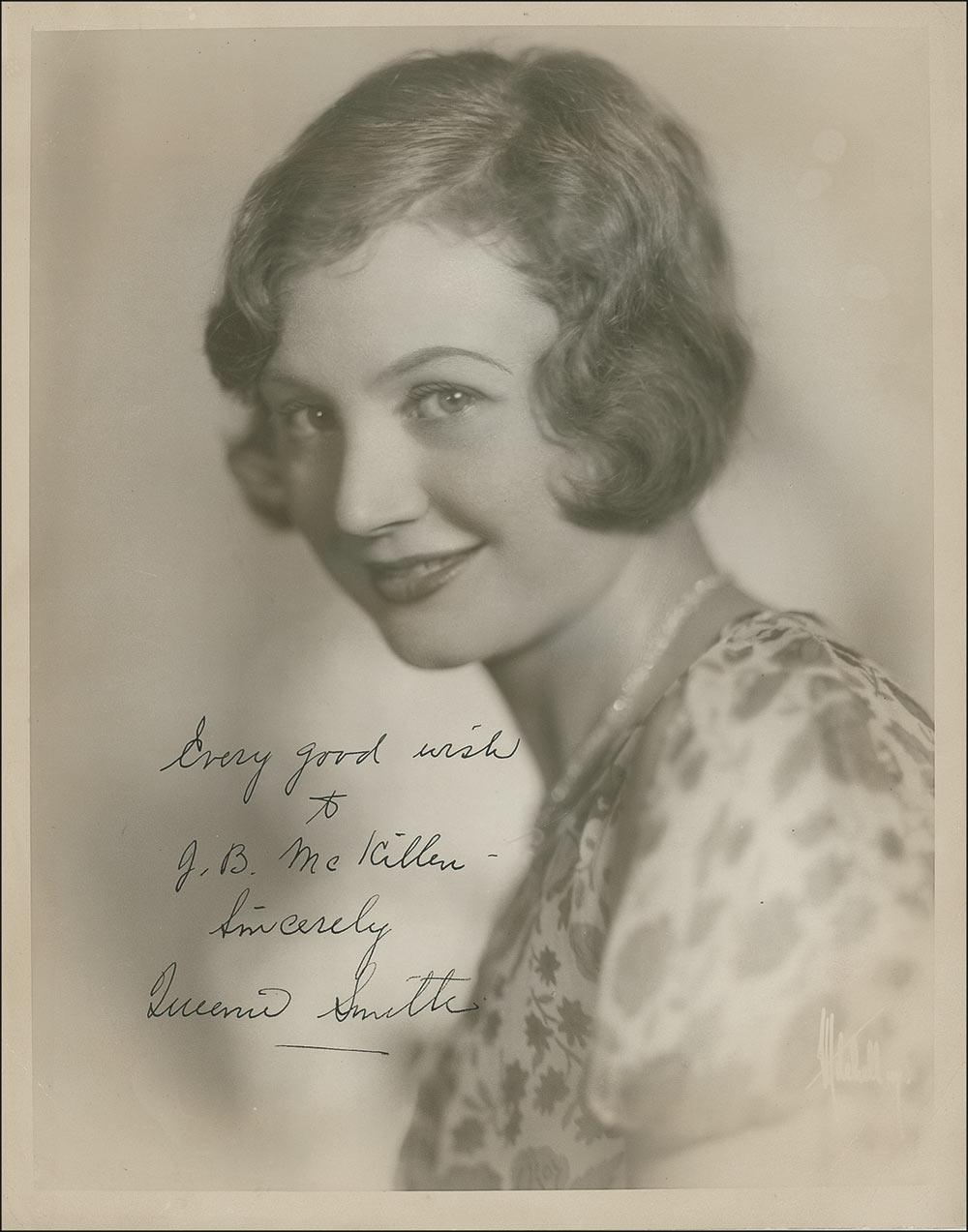 American stage, television, and film actress (1898–1978). Vintage matte-finish 10.75 x 14 photo, signed and inscribed in fountain pen “Every good wish to J. B. McKillen-Sincerely, Queenie Smith.” In very good condition, with scattered creases, mainly to corners, paperclip impression to top edge, and some scattered light toning.