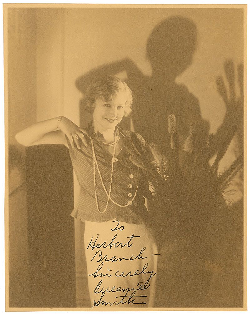 American stage, television, and film actress (1898–1978). Vintage sepia matte-finish 7.25 x 9.25 photo of Smith attractively posed and casting a large shadow, signed and inscribed in fountain pen, “To Herbert Branch—Sincerely, Queenie Smith.” In fine condition, with slightly trimmed edges.