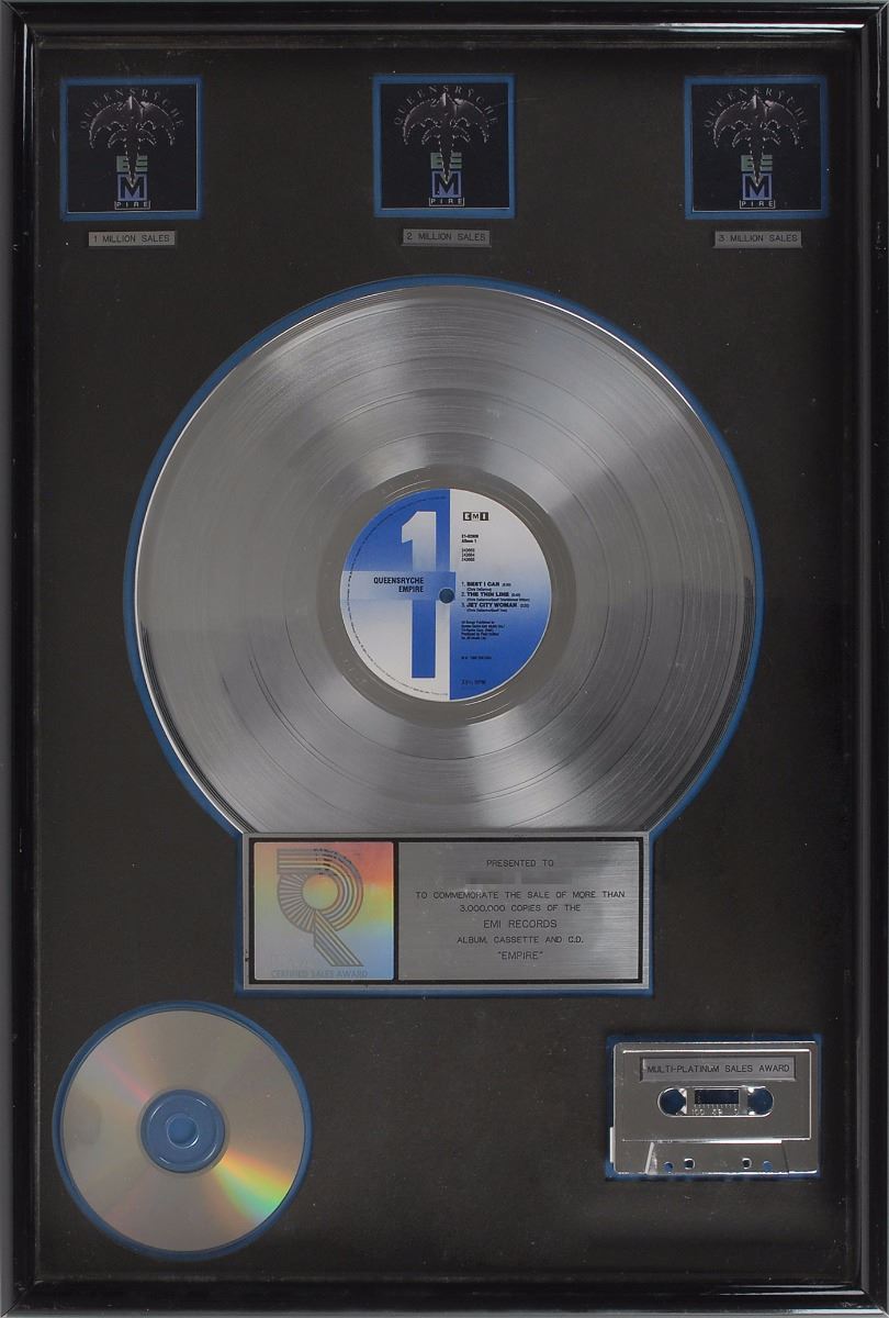 Official ‘R’ hologram-style RIAA triple platinum sales award presented “to commemorate the sale of more than 3,000,000 copies of the EMI Records album, cassette and C.D. ‘Empire.’” Framed with its plate, disc, CD, cassette, and three images of the album cover, each representing platinum sales, to an overall size of 17 x 25. Award retains its original backing with a Creative Glassics label. In fine condition.