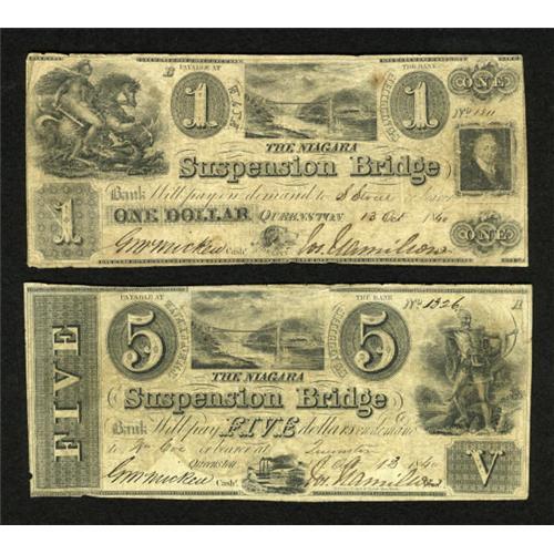 <B>Queenston, UC- The Niagara Suspension Bridge</B></I><BR>$1 Oct. 13, 1840 Ch. # 535-10-06-02<BR>$5 Oct. 13, 1840 Ch. # 535-10-06-06<BR> This is an evenly matched pair which grades <B>VG/F</B></I>.<BR><BR><b>Shipping:</b> Coins & Currency (<a target="_blank" href="http://www.heritageauctions.com/common/shipping.php">view shipping information</a>)