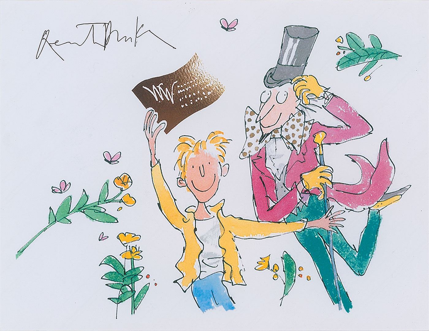 English cartoonist, illustrator and children's writer (born 1932) who is best known for illustrating books written by Roald Dahl; he won the international Hans Christian Andersen Award in 2002, and from 1999 to 2001 he was the inaugural British Children's Laureate. Color 11 x 8.5 heavy paperstock photo of a Blake illustration for Roald Dahl's Charlie and the Chocolate Factory, signed in black ink. In very fine condition.