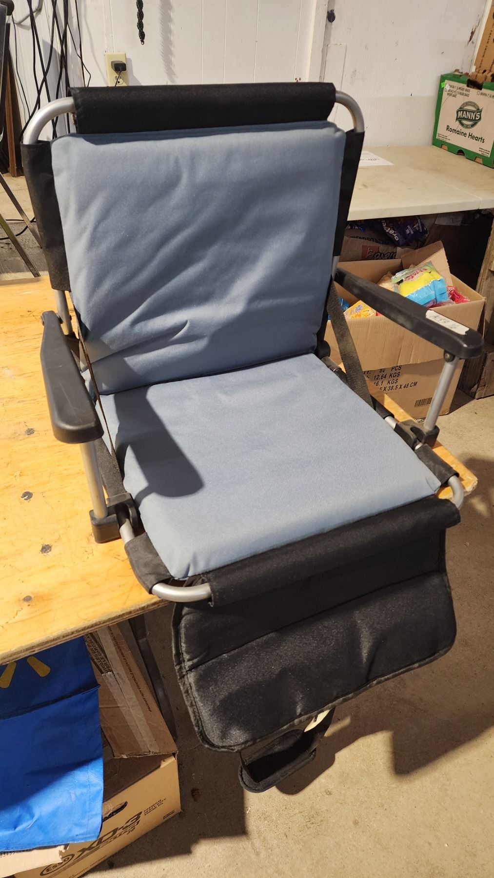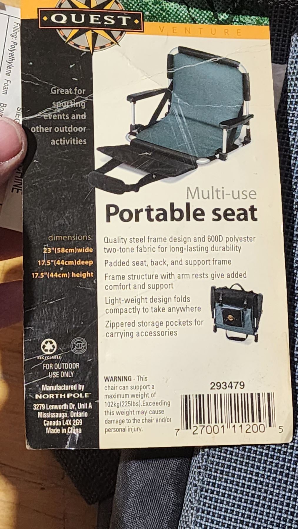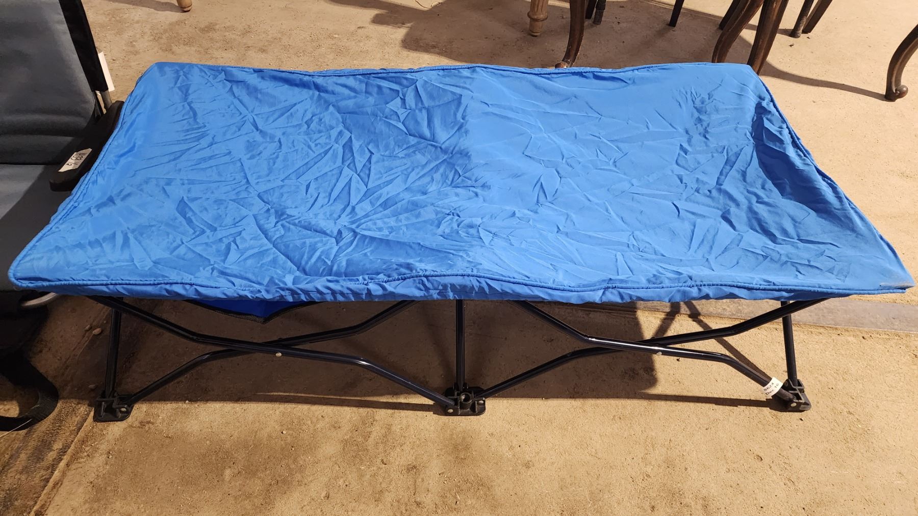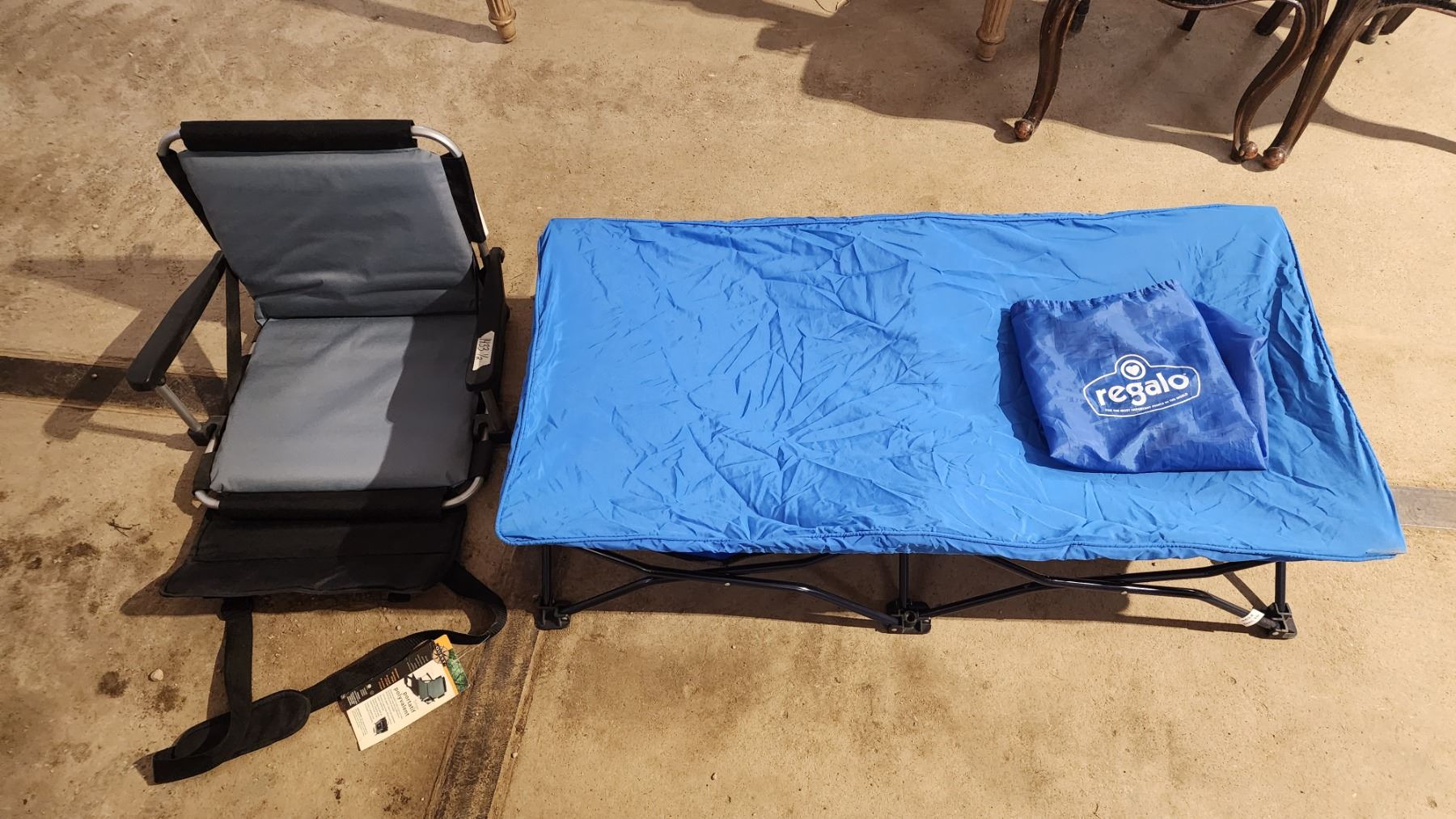 "Quest" folding stadium chair - has tags, appears unused & "Regalo" Toddler folding cot, c/w bed sheet and carrying bag - appears unused