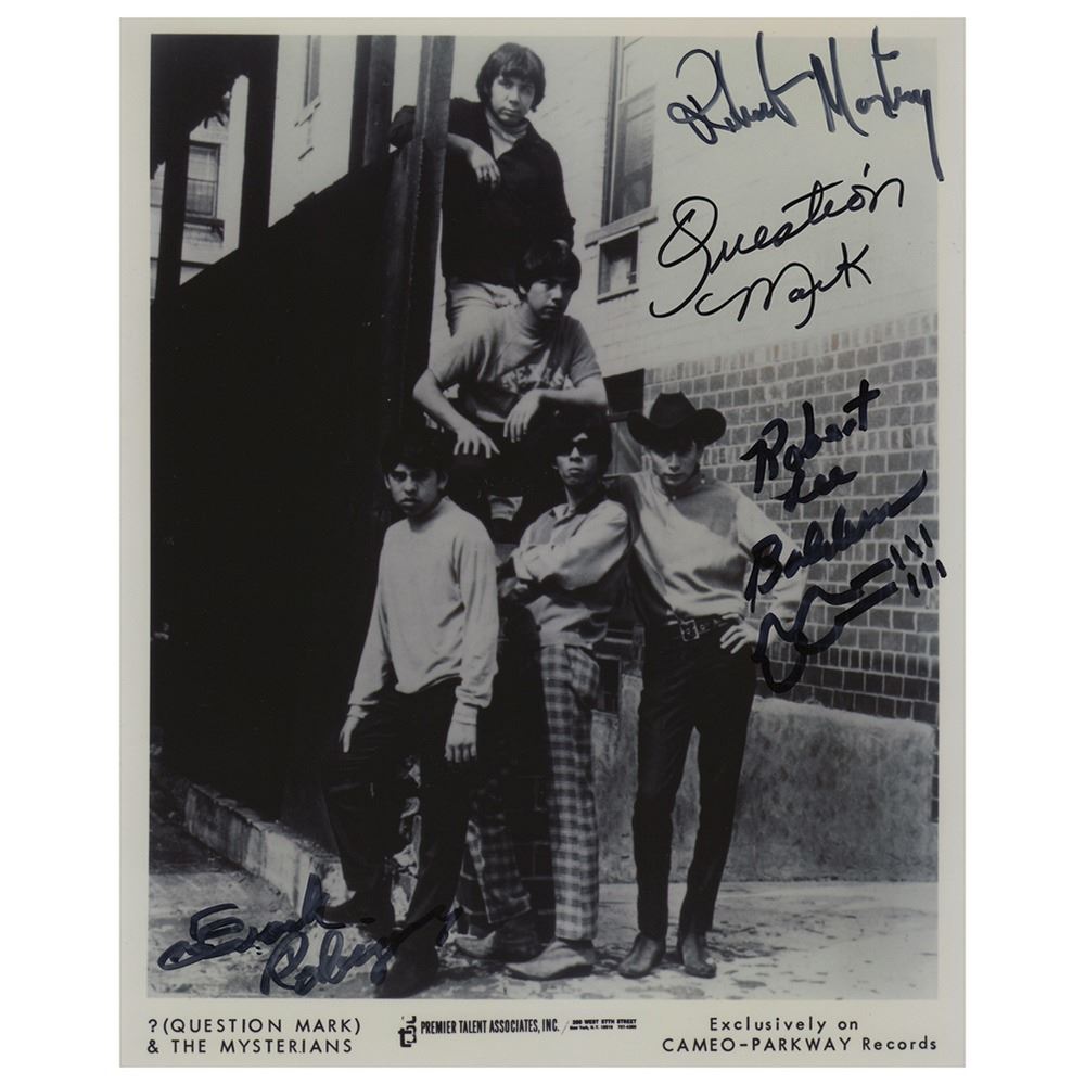 Glossy 8 x 10 photo of Question Mark and the Mysterians posing outdoors, signed in black felt tip by Question Mark, Frank Rodriguez, Robert Balderrama, and Robert Martinez. In fine condition.