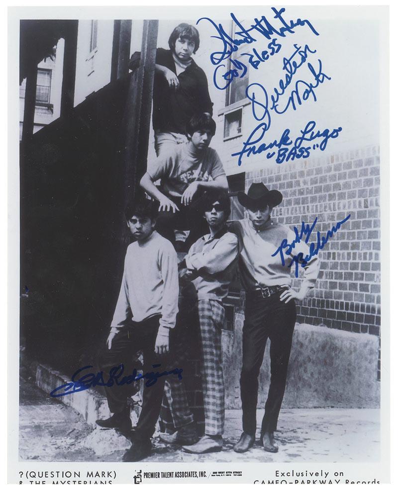 Glossy 8 x 10 group photo, signed in blue felt tip by Question Mark, Frank Lugo, Frank Rodriguez, Bobby Balderrama, and Robert Martinez. In fine condition.