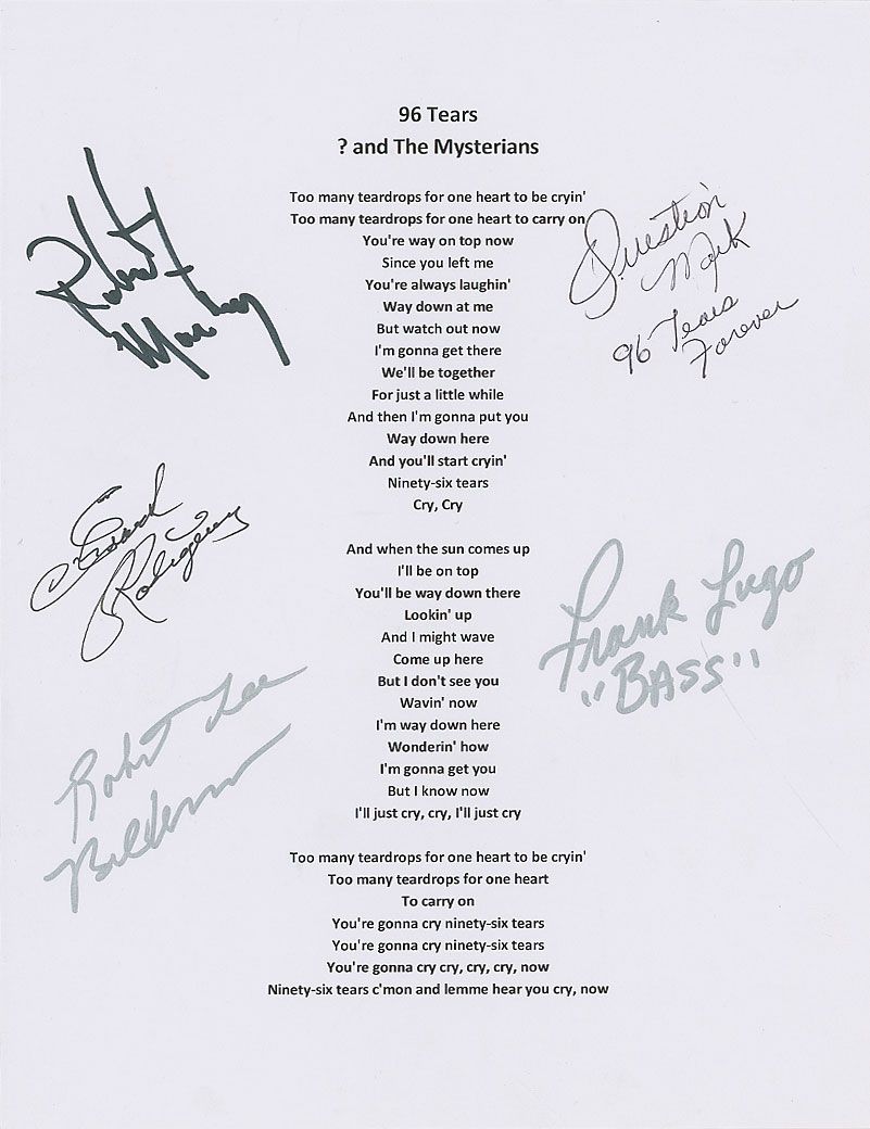 Printed souvenir lyrics to ‘96 Tears’ on a white 8.5 x 11 sheet, signed in black ballpoint, “Question Mark, 96 Tears Forever”; in silver ink by Frank Lugo, adding “Bass,” and Bobby Balderrama; and in black felt tip by Robert Martinez and Frank Rodriguez. In fine condition.