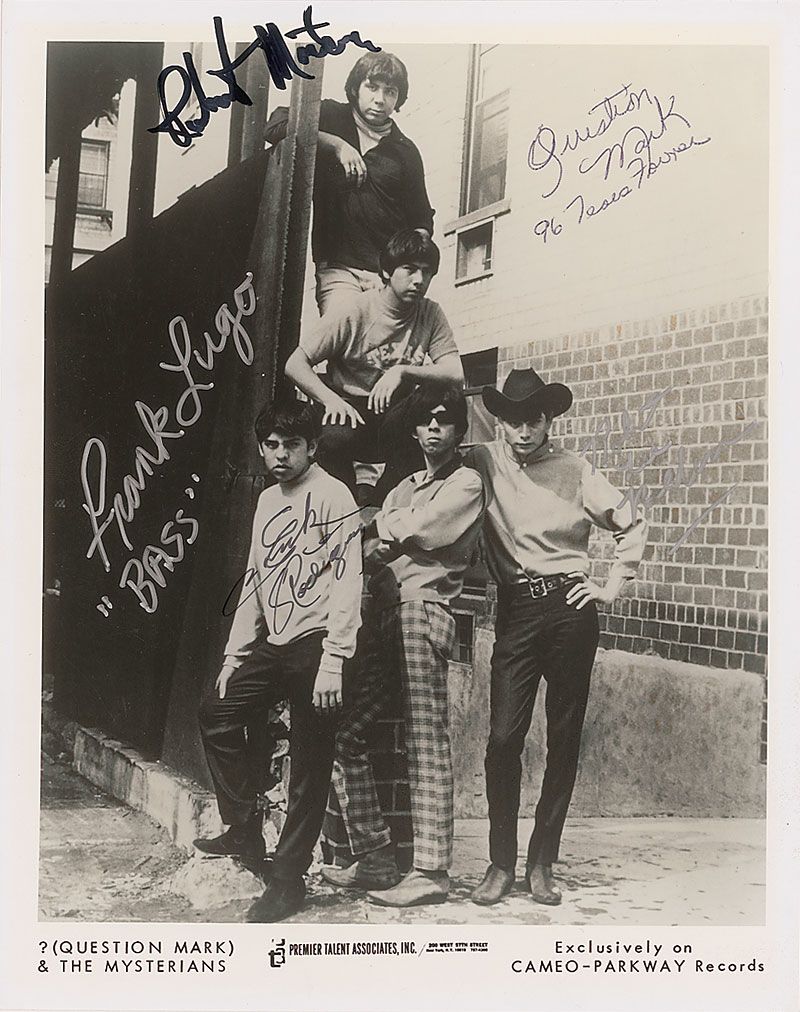 Glossy 8 x 10 publicity photo, signed in ink by Question Mark, Frank Rodriguez, Robert Balderrama, Robert Martinez, and Frank Lugo. In fine condition.