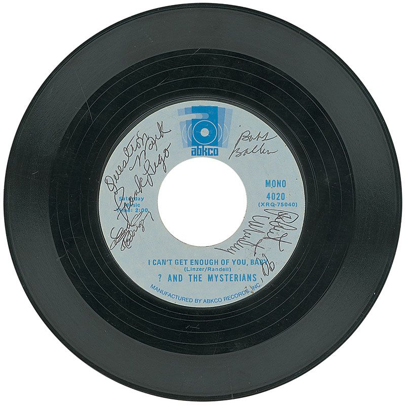 ABKCO 45 rpm record of ‘I Can’t Get Enough of You, Baby,’ signed on the label in black ballpoint by Question Mark, Frank Rodriguez, Robert Balderrama, Robert Martinez, and Frank Lugo. In fine condition.