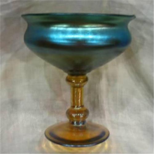 Quezal Compote 6 1/4" tall and 5 1/2" wide, blue/green will gold stem. Excelent condition, 1901-1920.