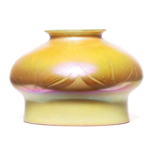 Quezal shade, opaque yellow glass with iridescent pulled design, signed, 3.5"h, minor chips to fitter rim