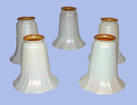 (5) Quezell Lamp Shades - White outside, amber inside. Shades glow to a warm amber when lighted. Approx. 5" H, flare to 5" D at widest point. No cracks or chips. Each shade is signed Quezell.