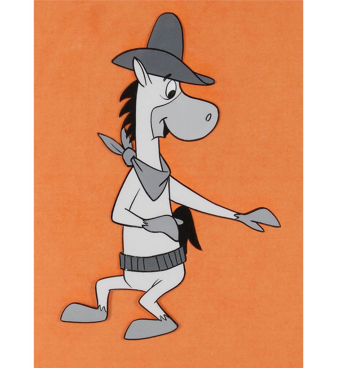 (Hanna-Barbera Studios, Circa 1960s) Original production cel featuring Quick Draw McGraw from a 1960s television commercial. Black and white image measures 4.25 x 6.25, with a mat opening of 9.5 x 7.5, and is double-matted to an overall size of 13.5 x 11.5 In fine condition.