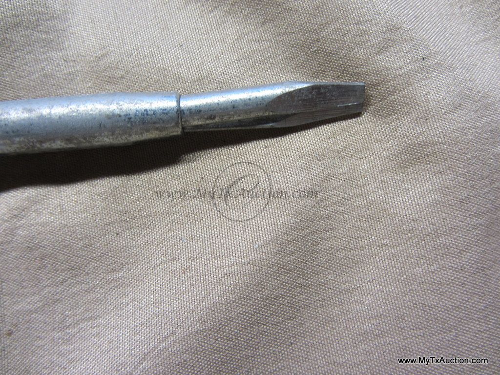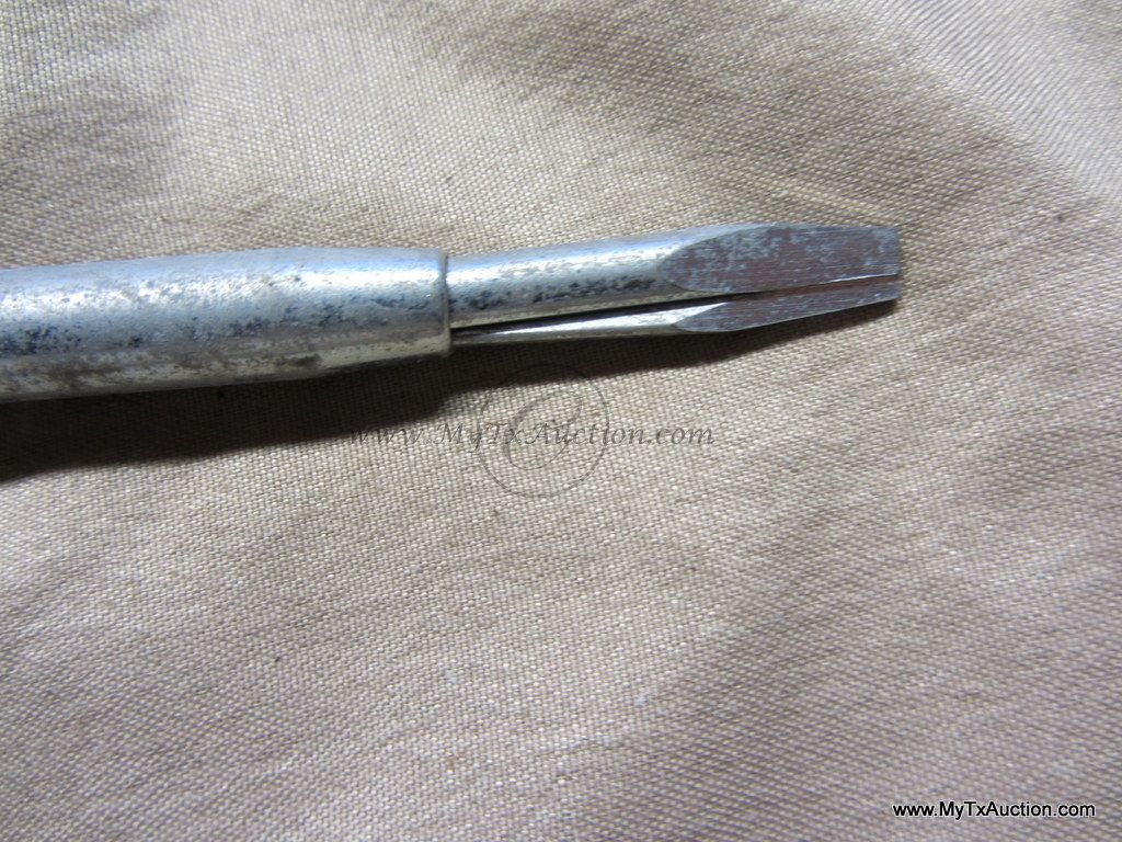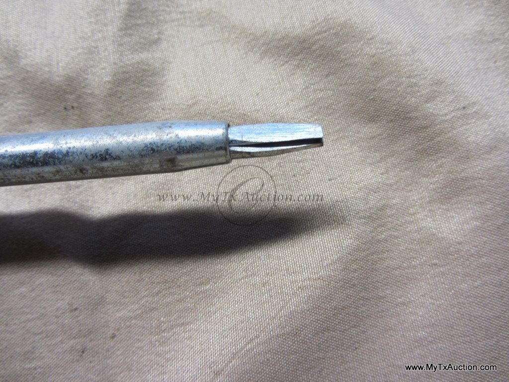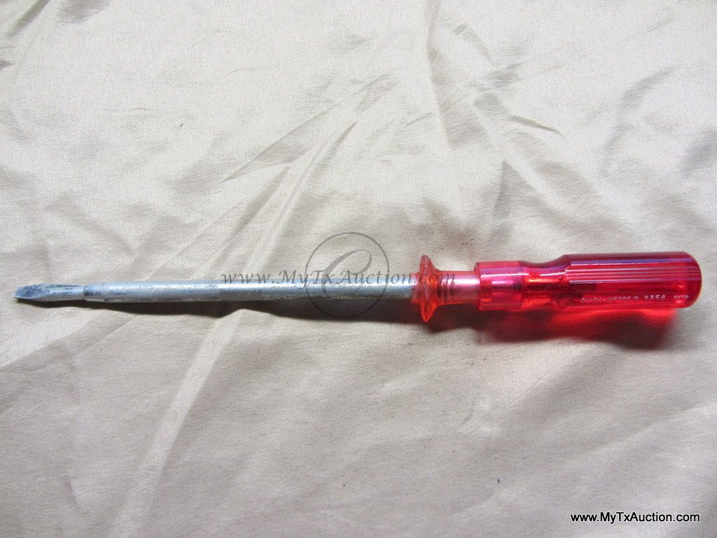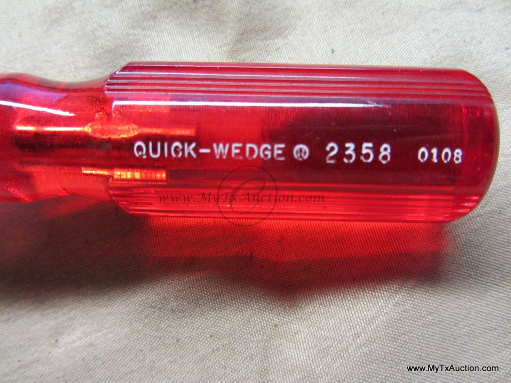 Quick-Wedge screwdriver offers a double split blade. The wedge type action of the double blade holds the slot of the screw tight, so that you can start, drive and set screws using one hand. Screw driving control and power are increased because the blade will not slip in the screw slot. Quick-Wedge lets you give your attention to the positioning of your work, without fumbling and dropping the screw. Blade Size: .25x8 Bit Thickness:.042 Length:12" Blades are spring steel & bit is hollow ground steel. Handle is shockproof and unbreakable plastic and the tubing is plated for rust resistance. DIRECTIONS: Step 1. two half-round spring steel blades are enclosed in a metal tube Step 2. as the tube is moved forward the split blades wedge into the crew slot. (screw is released by sliding tube back to handle) Step 3. Quick-Wedge® screwdrivers grip the screw so firmly it starts and drives the screw with ease. NEW