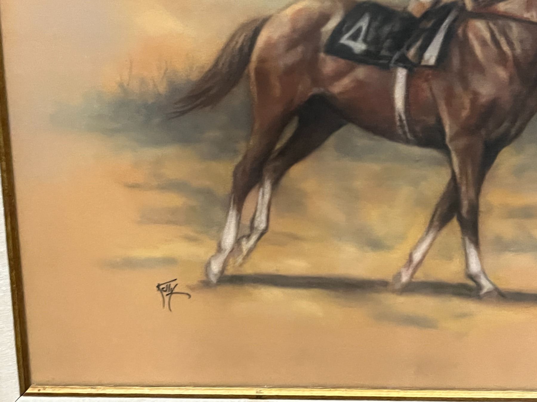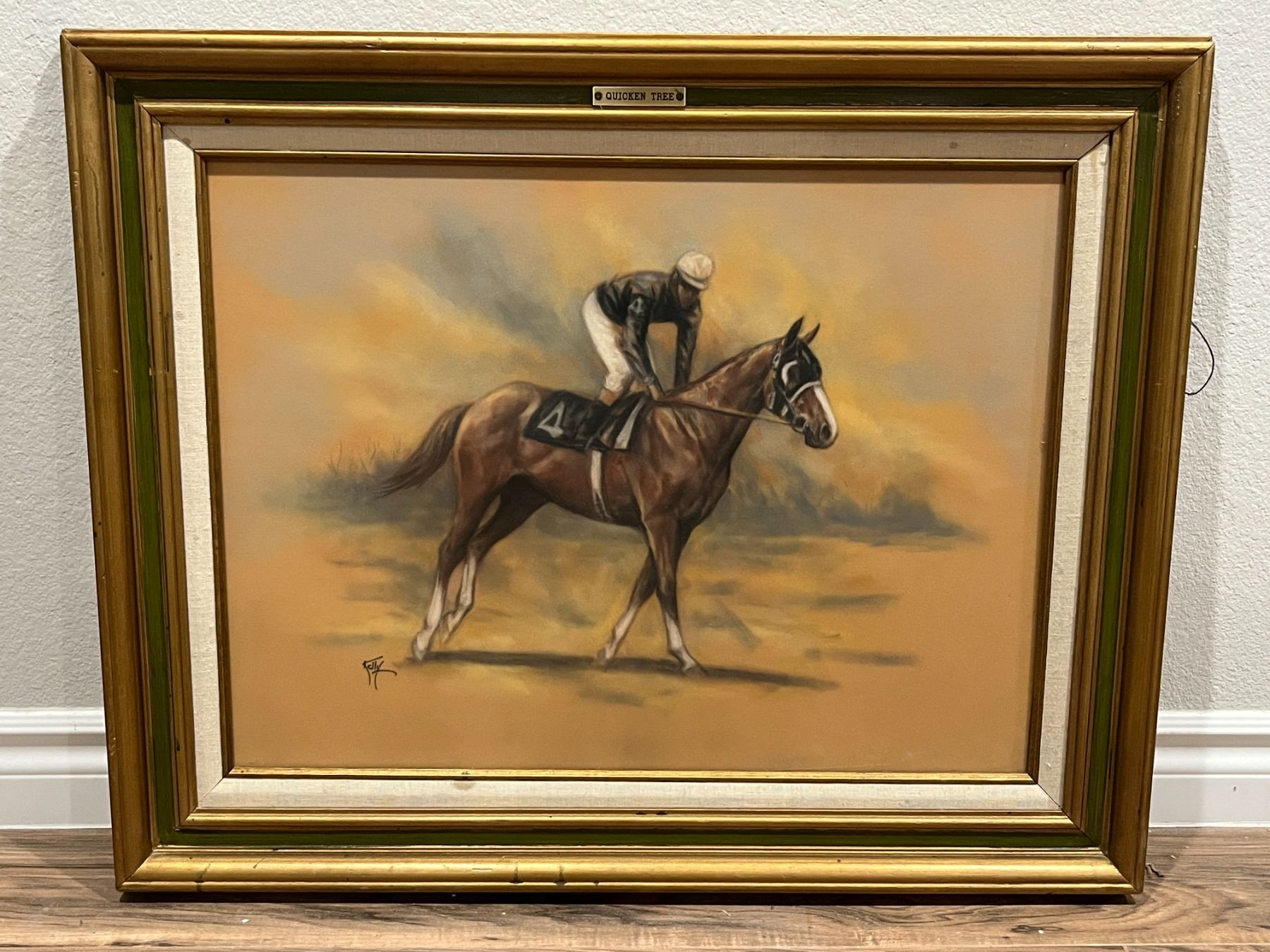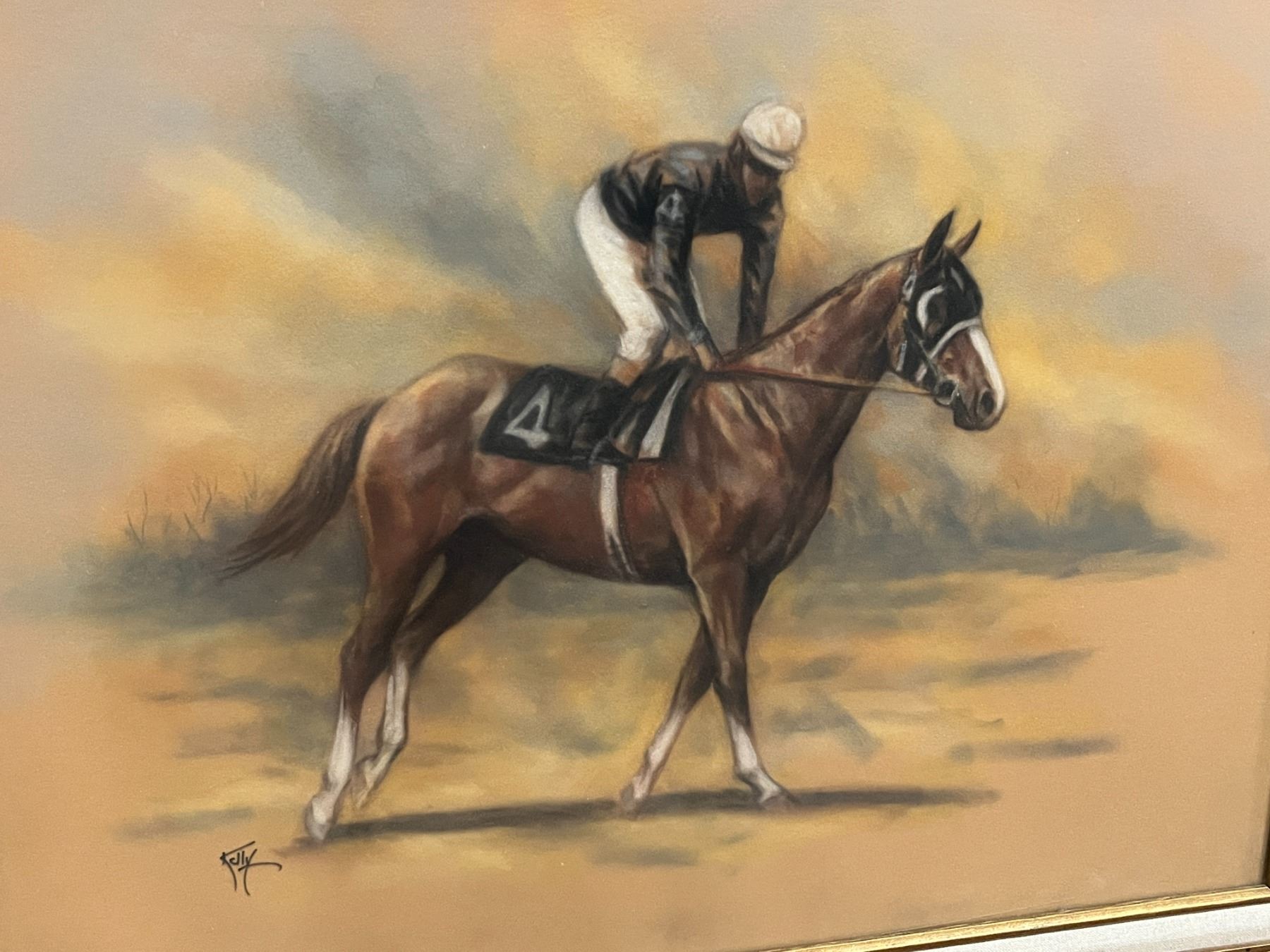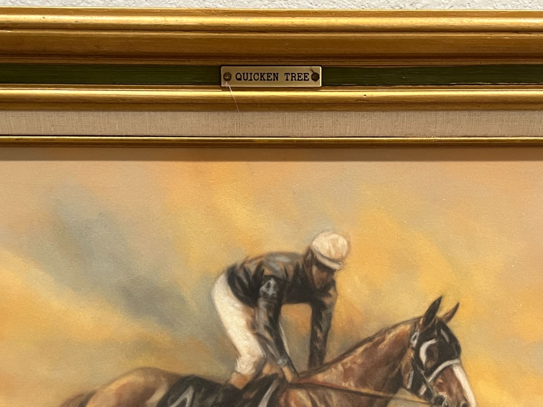 APPRAISER FAIR MARKET VALUE - $600 "Quicken Tree" by Merry *Kelly' Stevens (1937-1996): Pastel on paper circa 1970s depicting the thoroughbred and its jockey. Hand-signed by the artist. Measures approximately 18" high by 24" wide unframed and 24" high by 30" wide framed. Info in the horse is affixed to verso. LT14