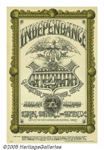 <B>Quicksilver Messenger Service Avalon Ballroom Poster #FD69 7-4-67 (Family Dog, 1967).</B></I> The "Independence Day" poster, designed by Rick Griffin, for a concert by Bay Area favorites Quicksilver Messenger Service, blues band Siegel Schwall, and the Phoenix. Wild <B>Zap</B></I>-style graphics, framed by an ornate seashell border printed in gold ink. Groovy! Poster measures 14.5" x 21.5"; paper has aged a bit, and the corners show some wear and tack marks; still, this is a flat, good-looking poster. VG.
