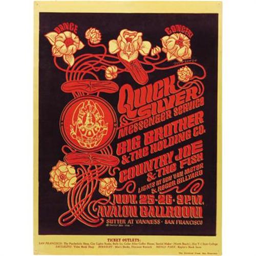 <B>Quicksilver Messenger Service Avalon Concert Poster FD-36 (Family Dog, 1966).</B></I> <B>Zap Comix</B></I> artist Victor Moscoso provided the "seed package"-inspired graphics for this attractive early Family Dog poster. Joining Quicksilver was Big Brother and the Holding Company (who had by that time added Janis Joplin as lead vocalist) and Country Joe and the Fish. The first-printing poster measures approximately 15" x 20", and is in VG+ condition, with tackholes in all four corners.<BR><BR><b>Shipping:</b> Flat Material, Large (<a target="_blank" href="http://www.heritageauctions.com/common/shipping.php">view shipping information</a>)