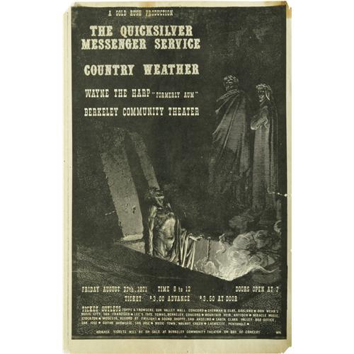 <B>Quicksilver Messenger Service Berkeley Concert Poster (Gold Rush, 1971)</B></I> Quicksilver Messenger Service have always been considered one of the best proponents of the "San Francisco" sound. Here's a poster from later in their career, playing at the Berkeley Community Theater with opening acts Country Weather and Wayne the Harp (formerly known as Aum). This uncommon 11" x 17" poster is in GD+, and has damage to all four corners, plus a few creases and tears, but would display nicely in a frame.