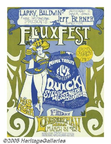 <B>Quicksilver Messenger Service Flux Fest Longshoreman Hall Poster 3-31-67 (Larry Baldwin., 1967).</B></I> This odd concert, featuring the San Francisco Mime Troup, is billed as "a strange evening of experimental events." Come to think of it, this is San Francisco, at the dawn of the Summer of Love -- nothing odd about it at all! Headliners Quicksilver Messenger Service were a hot draw, thanks to the guitar pyrotechnics of John Cipollina. The poster measures 13.5" x 18", and has an unusual feature -- the backside was run through the press once, leaving a yellow print! NM-.