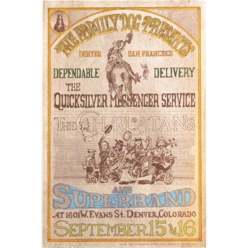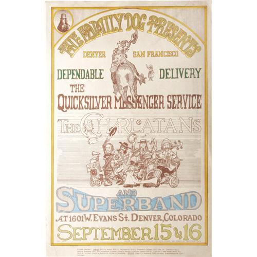 <B>Quicksilver Messenger Service "Hee Haw" Concert Poster FD-D2 and Postcard (Family Dog, 1967)</B></I> A faux "Wild West" look gives this poster, part of the Family Dog's Denver series, a striking appearance. This was especially appropriate to the bands involved; the Charlatans often appeared in period costume, while Quicksilver Messenger Service would adopt similar Western graphics for their 1968 second album, "Happy Trails". This 15" x 23" VG++ first printing poster is complemented by the scarce NM postcard, which is quite a find in its own right.