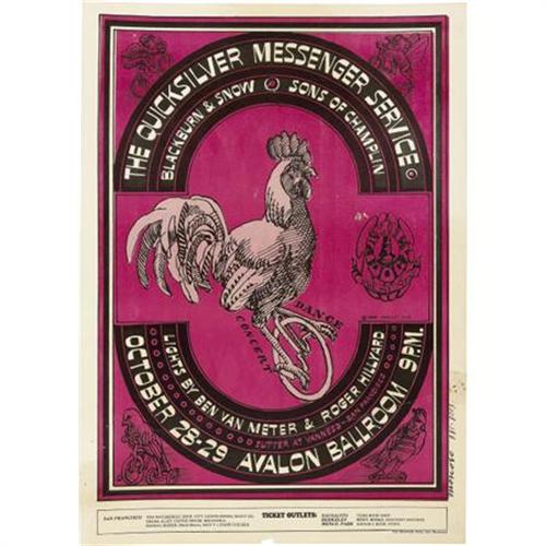<B>Quicksilver Messenger Service "The Chicken on the Unicycle" Avalon Concert Poster FD-32 (Family Dog, 1966)</B></I> Classic design by Victor Moscoso. Opening acts included Sons of Champlin. Original printing. Approximate size 14.25" x 20. In Good condition, with creases, edge wear, light stains, multiple tack and staple holes.<BR><BR><b>Shipping:</b> Flat Material, Large (<a target="_blank" href="http://www.heritageauctions.com/common/shipping.php">view shipping information</a>)