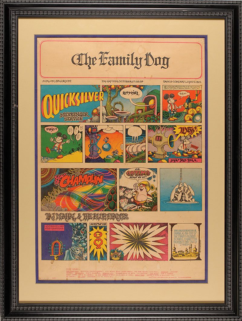 Quicksilver Messenger Service concert poster, 13.5 x 19.5. A first printing from the Family Dog series FD-89, featuring Rick Griffin artwork for an Avalon Ballroom three-night stand in October ’67 with Quicksilver Messenger Service, The Sons of Champlain and Taj Mahal. Double-matted and framed to an overall size of 20 x 26.5. In very good condition, with a uniform shade of toning, scattered soiling, and small tack holes to each corner.