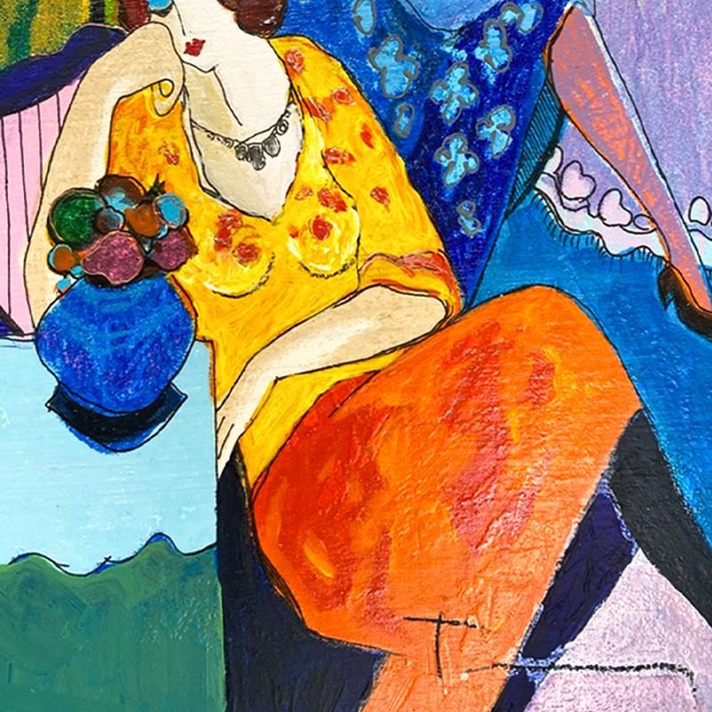 "Quiet Afternoon" is a one-of-a-kind mixed media over paint on wood by Itzchak Tarkay (1935-2012), hand signed by the artist. Includes Letter of Authenticity. Measures approx. 11.5" x 8" (image).