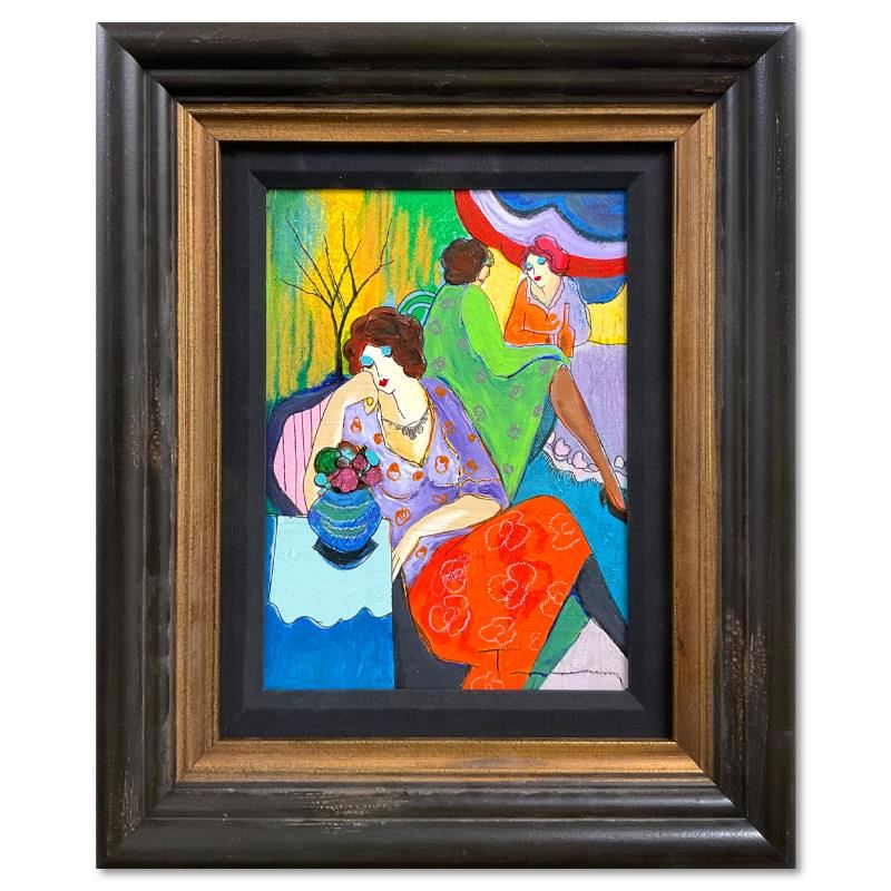 "Quiet Afternoon" is a one-of-a-kind mixed media over paint on wood by Itzchak Tarkay (1935-2012), hand signed by the artist. This piece comes custom framed. Includes Letter of Authenticity. Measures approx. 17.5" x 14.5" (frame), 11" x 8" (image). There are 2 small chips on the back edge (where the frame meets the wall) of the frame that are only visible when the piece is not displayed.