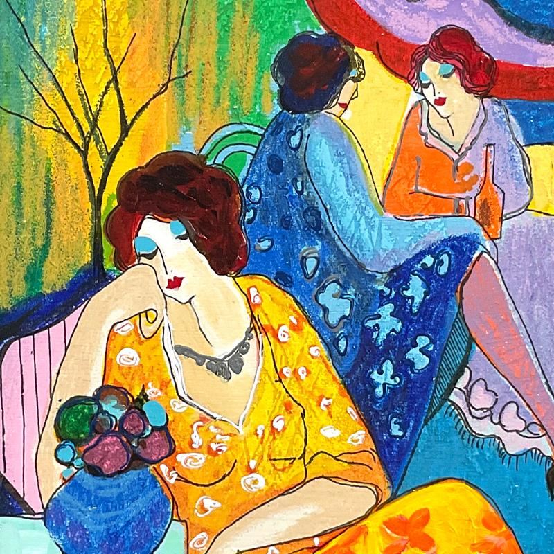 "Quiet Afternoon" is a one-of-a-kind mixed media over paint on wood by Itzchak Tarkay (1935-2012), hand signed by the artist. This piece comes custom framed. Includes Letter of Authenticity. Measures approx. 16.5" x 13.5" (frame), 11" x 8" (image).