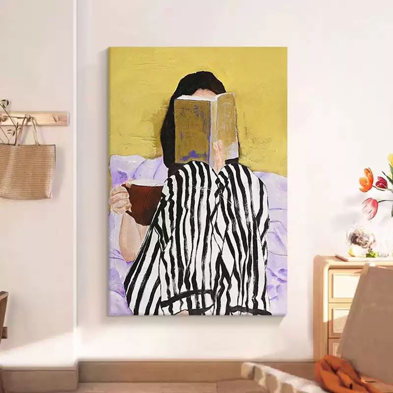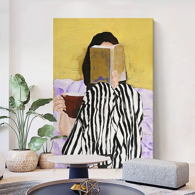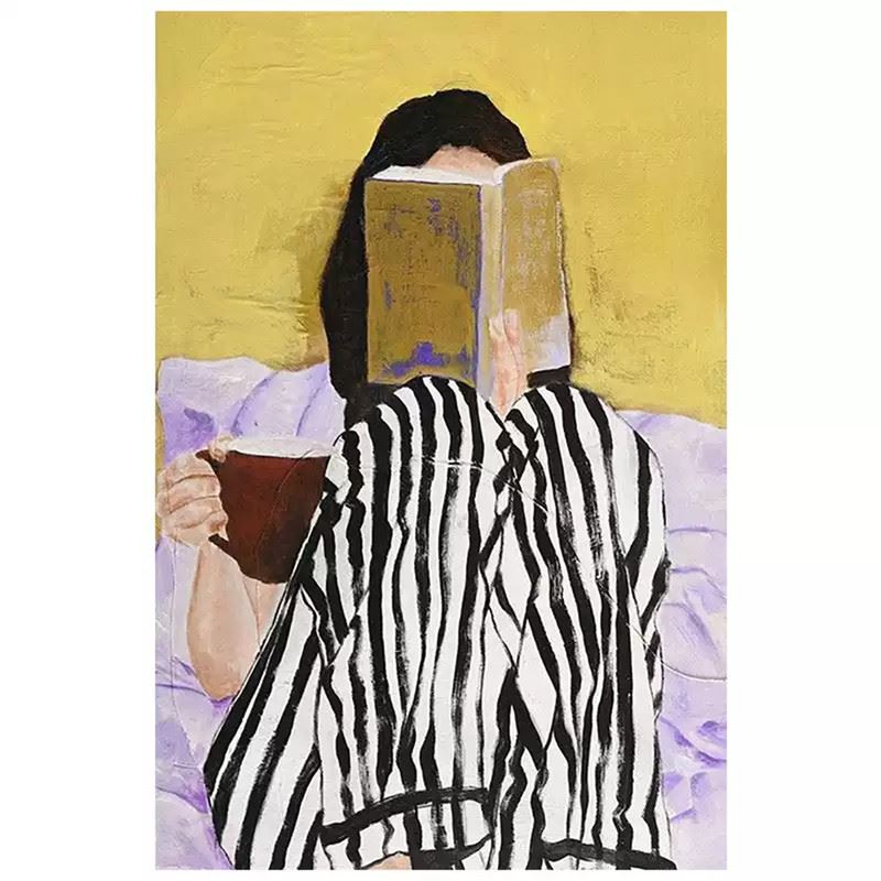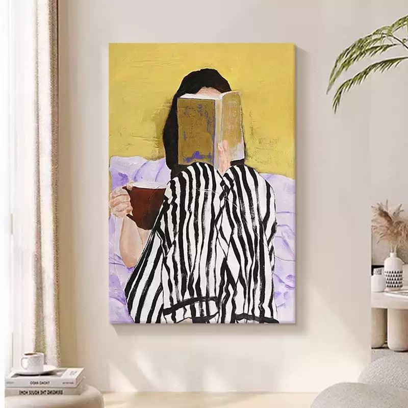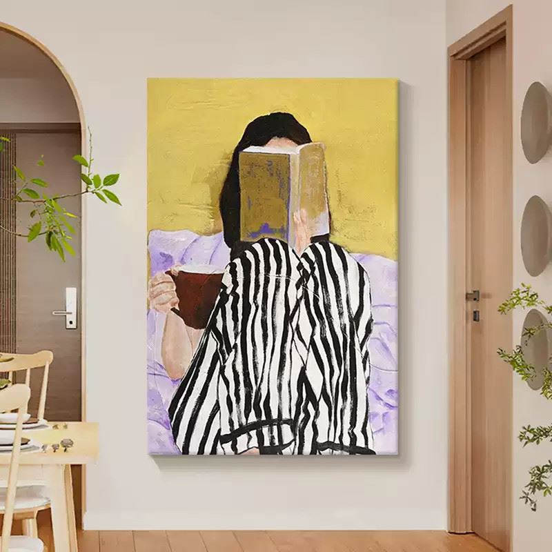 In this intimate scene, a figure is captured in a moment of peaceful solitude, engrossed in a book while sipping a drink. The strong contrast between the bold black-and-white stripes of the attire and the soft, pastel background brings focus to the figure's calm yet absorbed demeanor. The cover of the book obscures her face, inviting the viewer to imagine the world within the pages, while the warm yellow background adds a touch of comfort and tranquility to the overall composition. This piece evokes a sense of quiet reflection and personal escape. Dimensions: 24 x 35 inches.