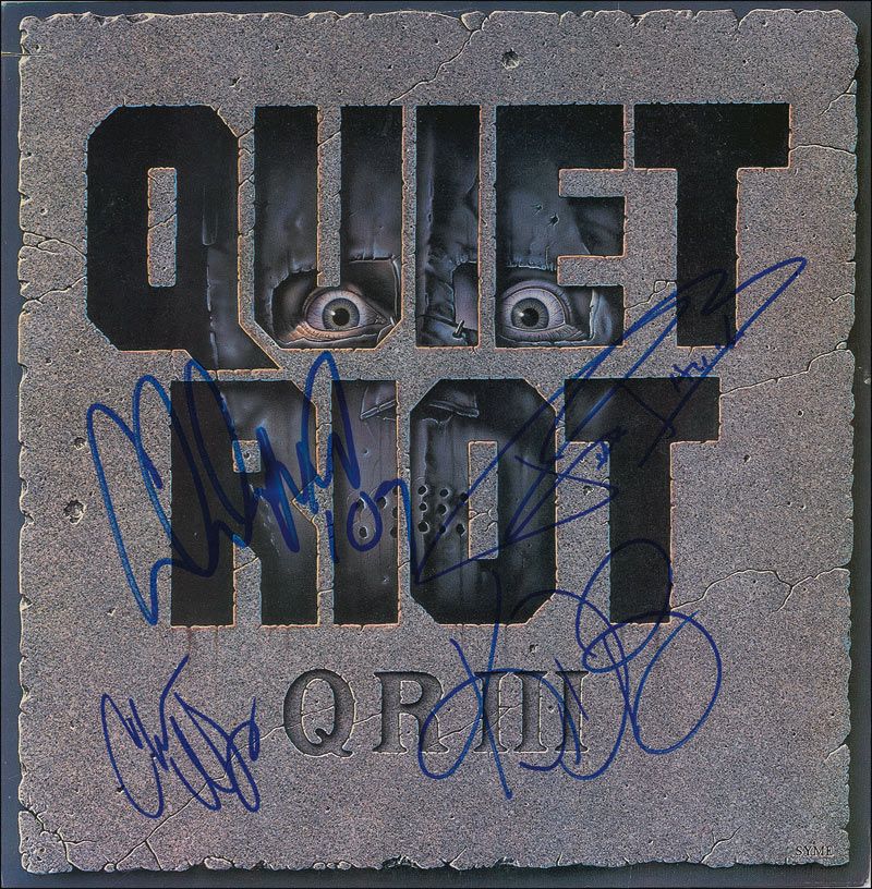 QR III album signed on the front in blue felt tip by Kevin DuBrow, Frankie Banali, Carlos Cavazo, and Chuck Wright. In fine condition, with a light ‘ring of wear’ on the back. The record is included.