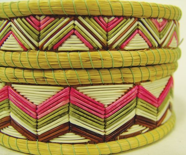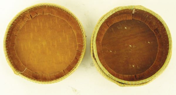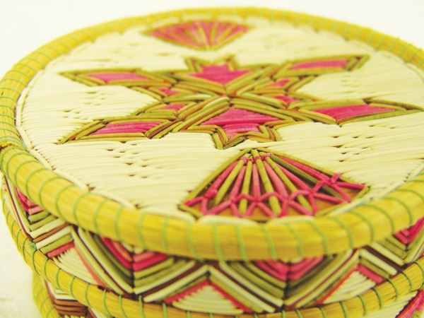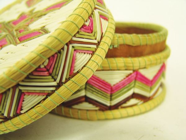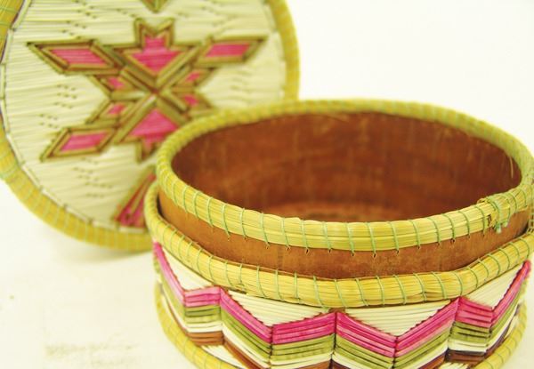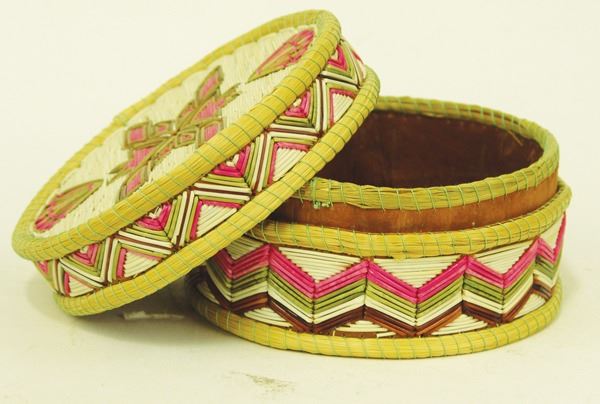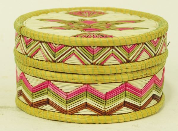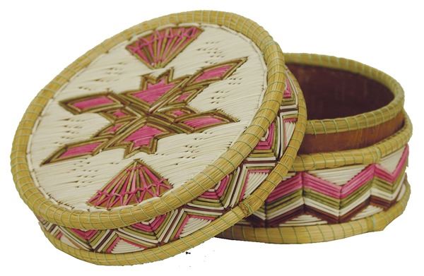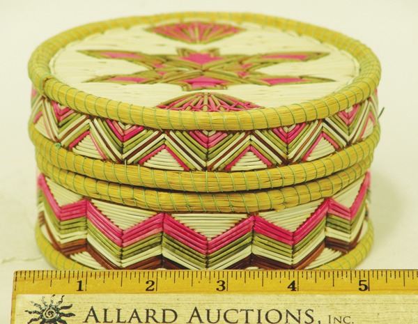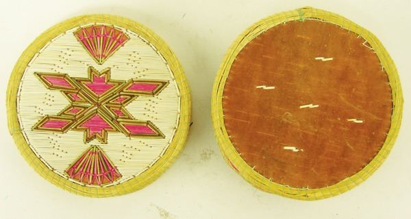 Traditional, lidded, birch bark basket covered entirely with colored and natural porcupine quills, with geometric symbol on the lid. Very good condition.Ca. 1970s-1980s5-1/4" x 3"