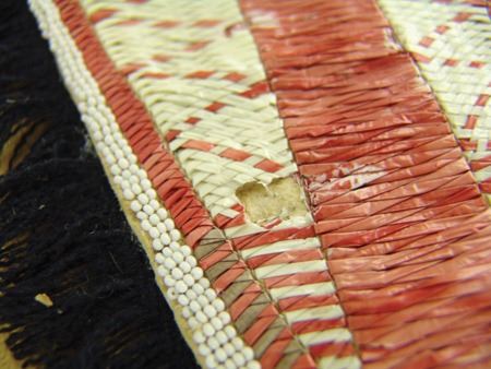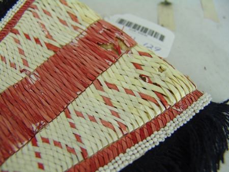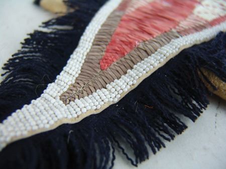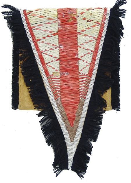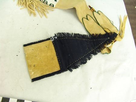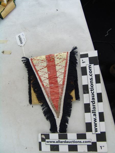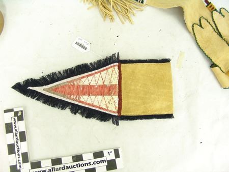Mid/Late 1900s, Classic design Mandan style belt bag with fringed triangular tab hold and exquisite diamond quill work. Good condition, but has some quill loss. 5-1/2" x 5-1/4" plus fringe