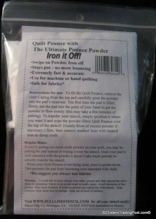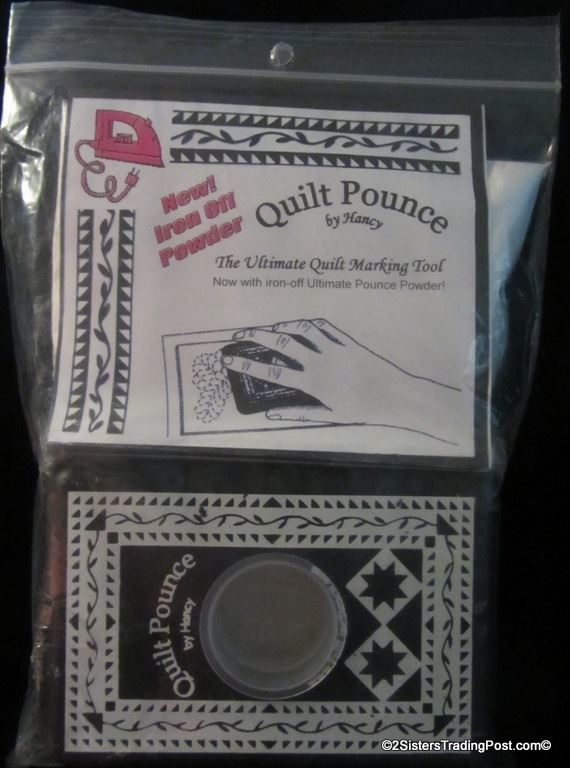 Hancy Quilt Pounce Kit, comes with the powder pad and 2 ounces of white chalk pounce powder. Remove pounce powder with iron or damp cloth.