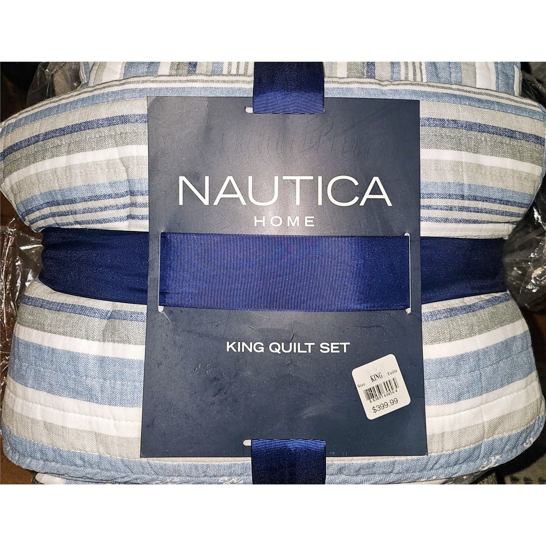 Nautica king size quilt set with striped design, includes coordinating pieces, new.