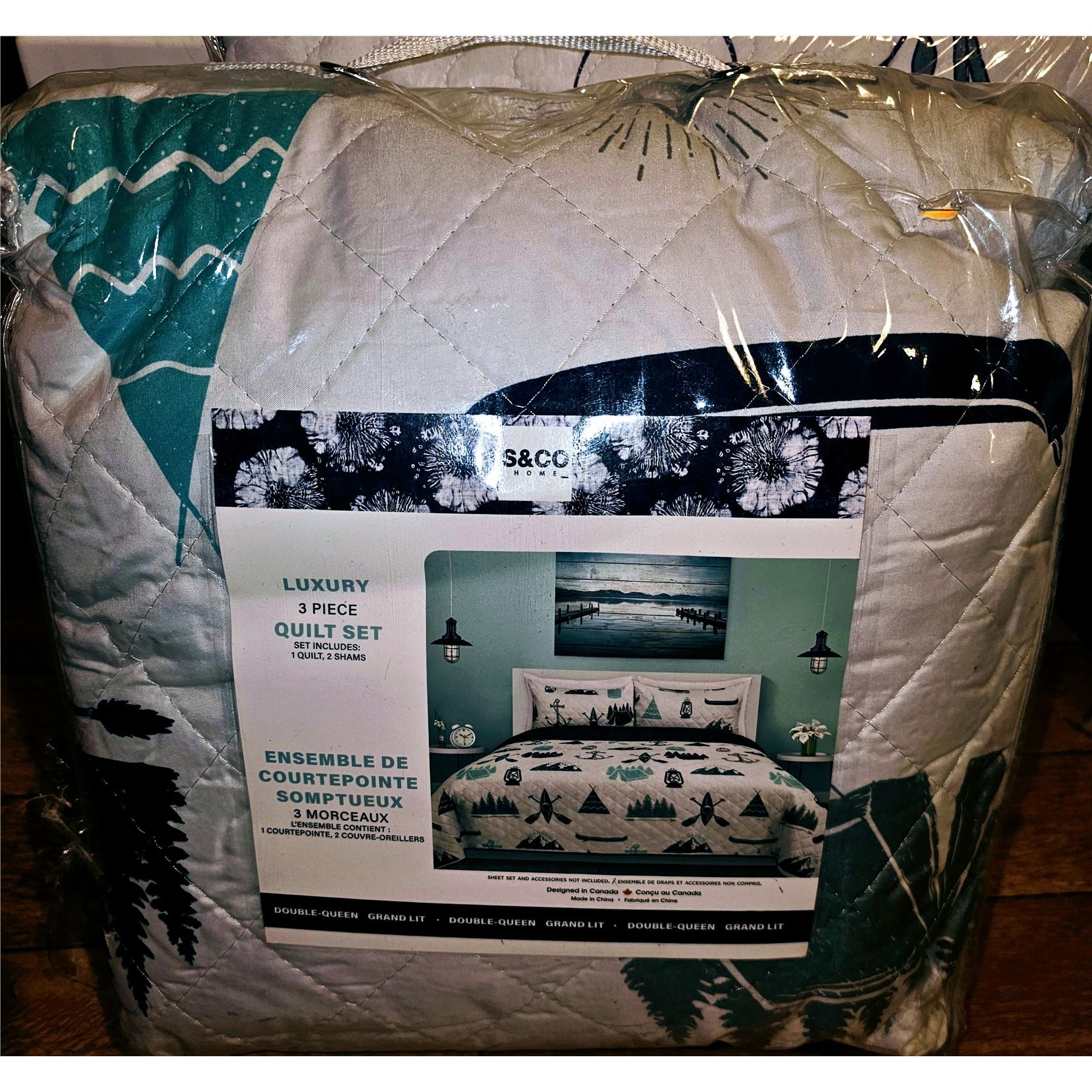 Double-Queen size, includes 1 quilt and 2 shams, nature-inspired design, new.