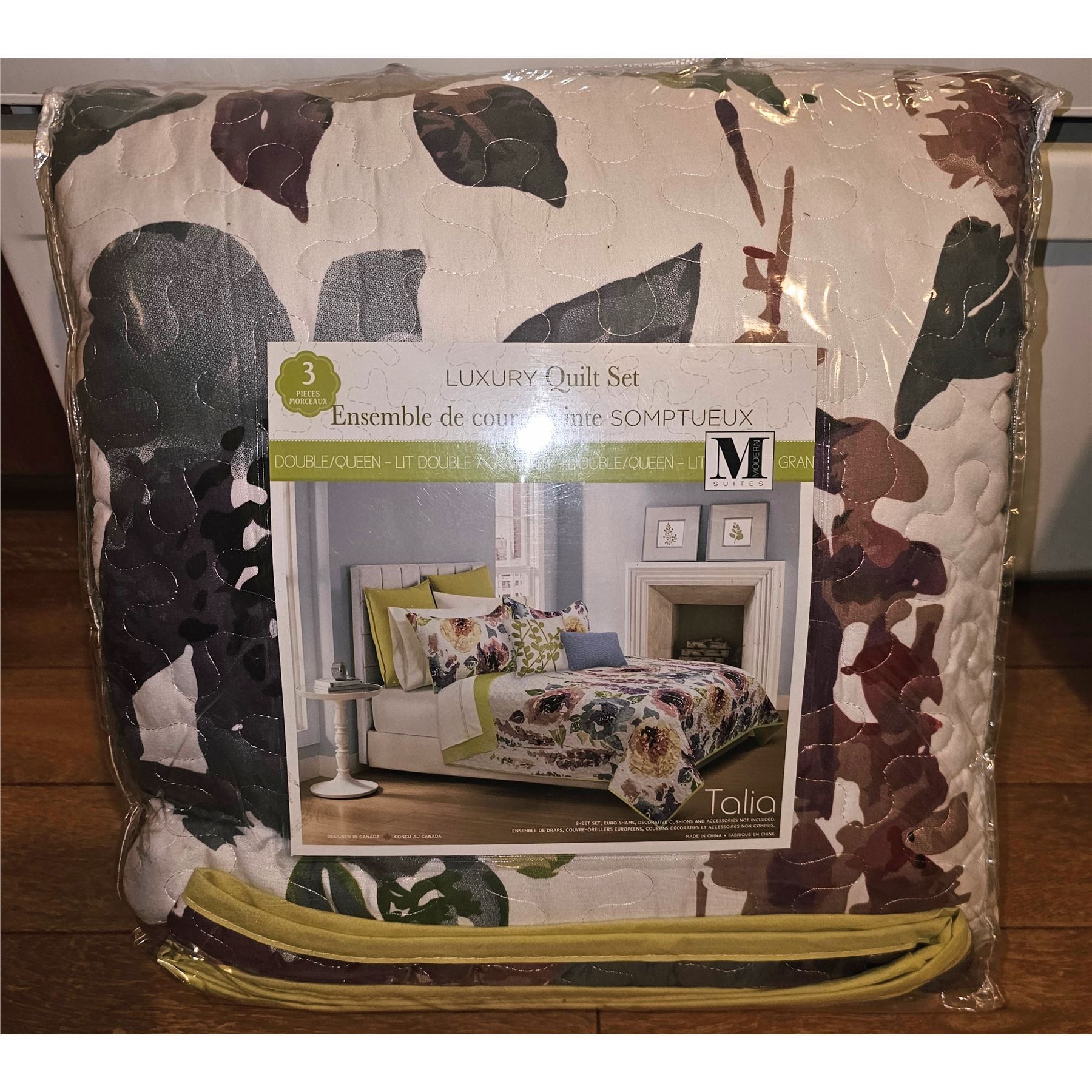 Double/queen size with leafy vine pattern, includes quilt and two shams, new.