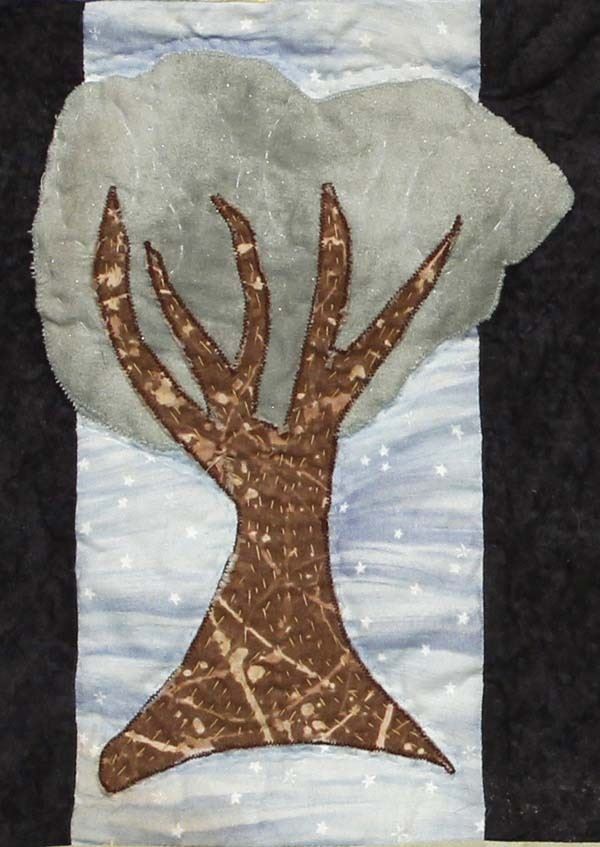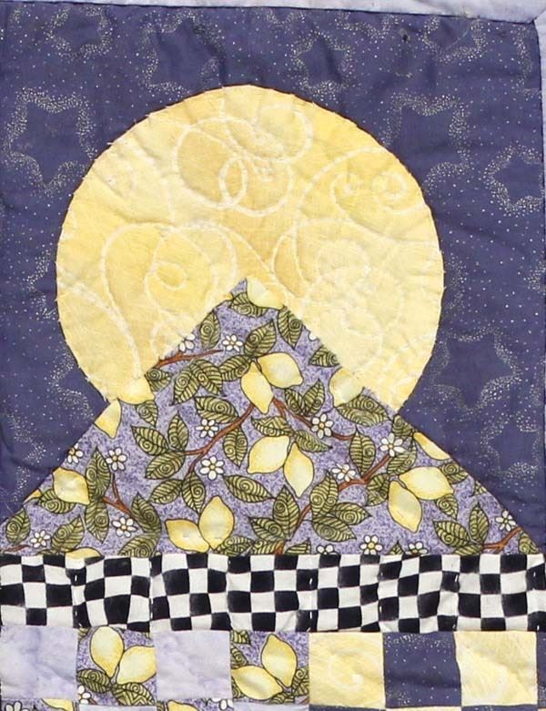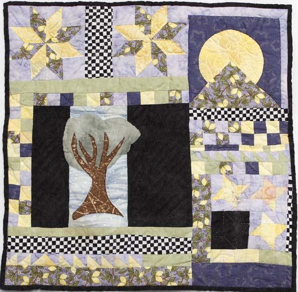 Quilted Coverlet, measures 22''square, features tree and moon, 8 point stars