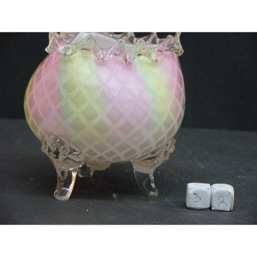 Applied feet with small nicks at the edges, clear applied ribbon area around the top, clearly Victorian, 1880-1910 era, triangular opening at the top, 4 1/2" wide and tall, pink, yellow and some form of white glass for the interior of the bowl. Very colorful diamond band patterns.