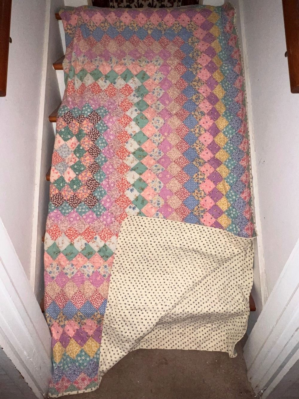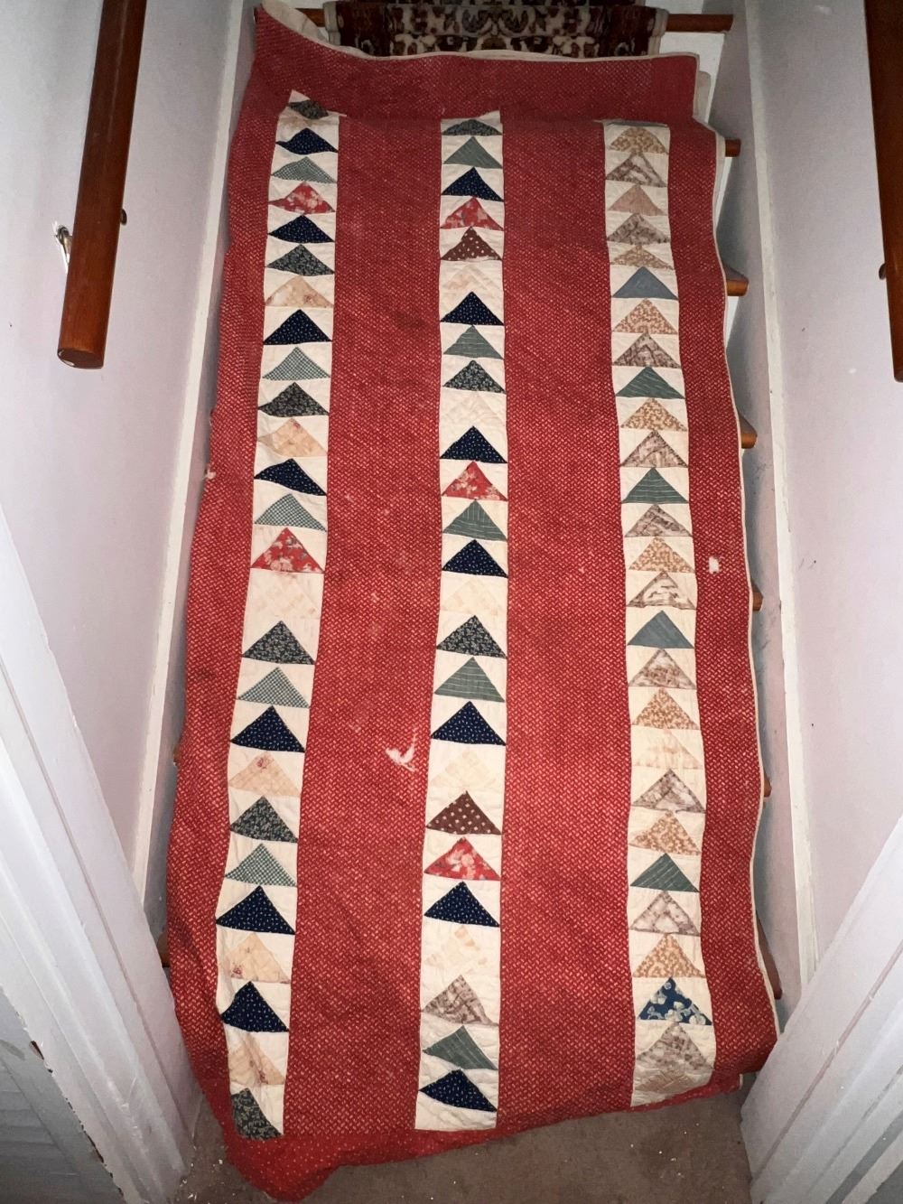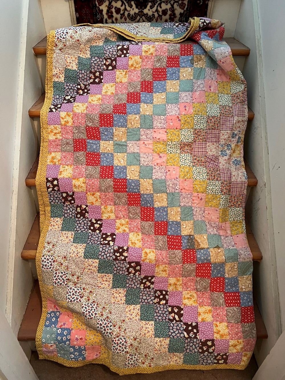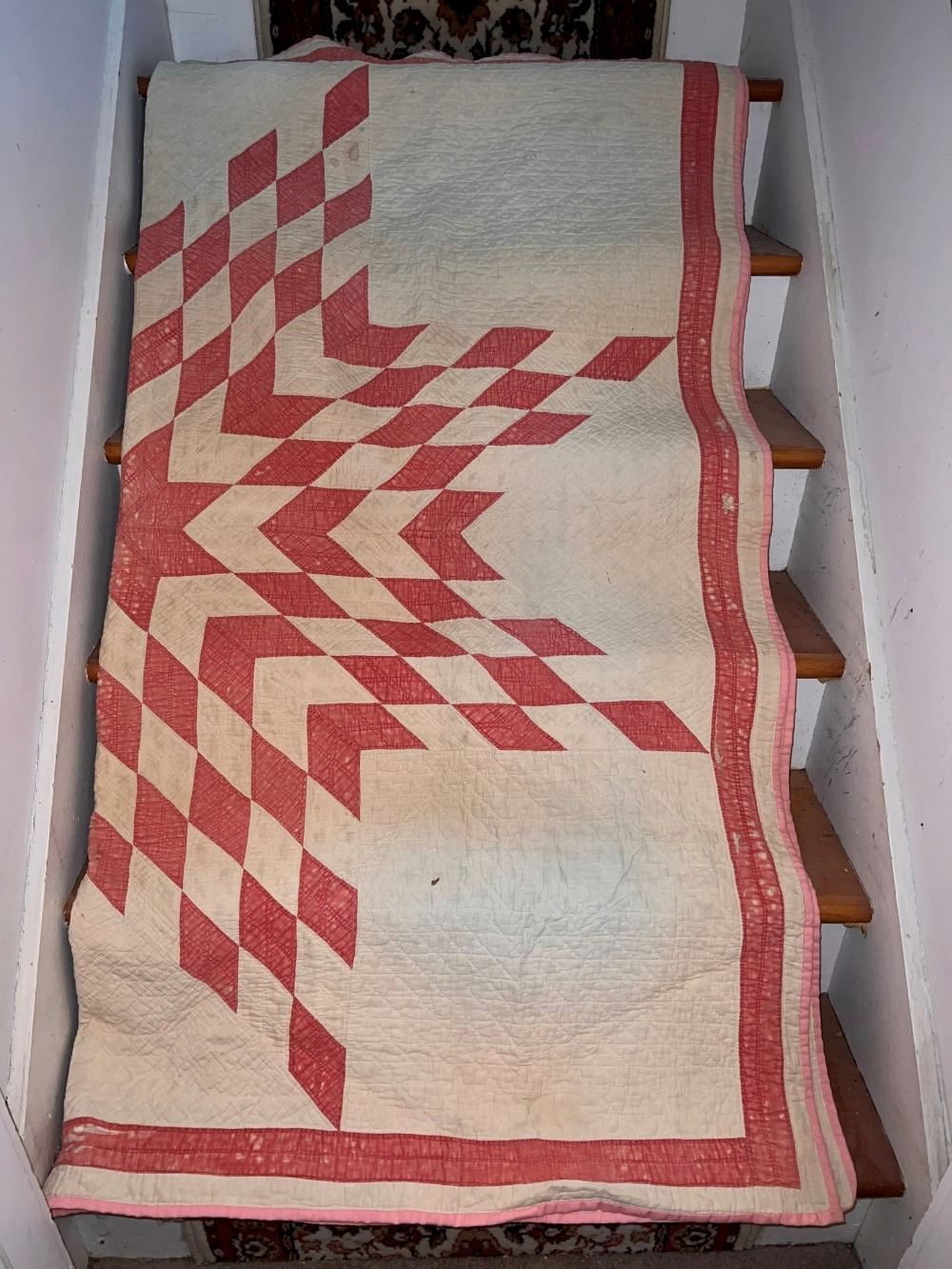 Handmade quilts. 2, yellow backed quilts. One measures approx. 73 inches tall x 70 inches wide and the other measures approx. 66 inches tall x 65 inches wide. A red quilt with triangle designs measures approx. 6ft tall x 72 inches wide. A pink and white quilt with a large star design that measures approx. 68 inches tall x 64 inches wide. And a white backed that quilt measures approx. 76 inches tall x 74 inches wide.